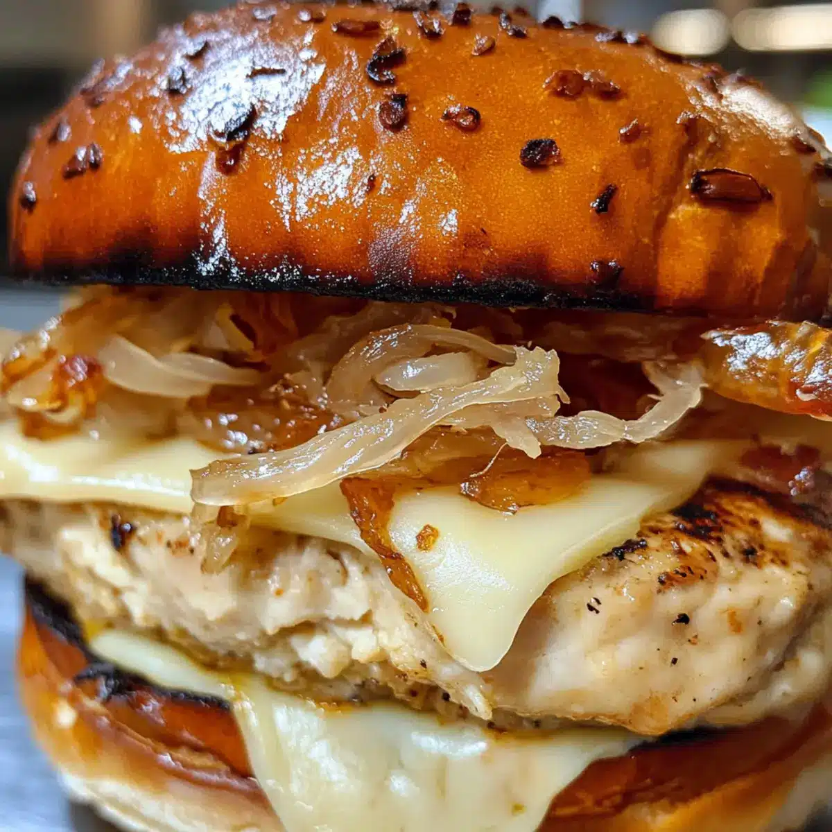 Beginne mit dem unteren Brötchen und platziere ein Patty mit geschmolzenem Käse darauf. Füge großzügig abgetropftes Sauerkraut und knusprige Zwiebelringe hinzu, um sowohl Textur als auch Geschmack zu bieten. Träufle etwas Ahornsirup oder Dijon-Senf darüber und setze das obere Brötchen auf. Drücke leicht zusammen, um einen perfekten Ahorn-Senf-Hühnchen-Burger zu kreieren.