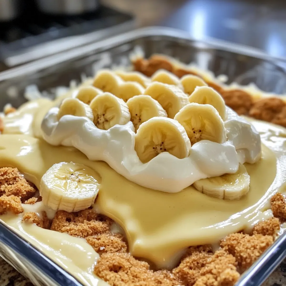 Schneide reife, aber feste Bananen in gleichmäßige Scheiben und verteile sie gleichmäßig über die Waffeln. Diese Schicht sorgt für natürliche Süße und Cremegeschmack, die den Bananenpudding Ever einzigartig machen. Versuche, die Bananen schnell nach dem Schneiden zu verwenden, um ein Braunwerden zu vermeiden.