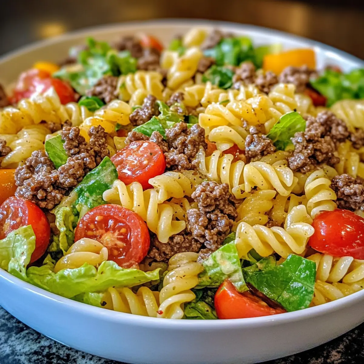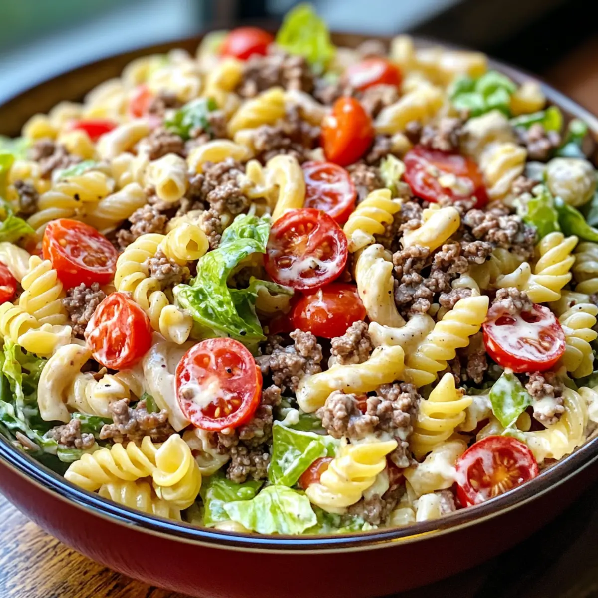 In einer großen Schüssel nimmst du die abgekühlte Pasta und gibst das gebratene Rinderhackfleisch, die Tomaten, den Romanasalat, die rote Zwiebel, den Cheddar-Käse und die Pickles dazu. Achte darauf, alles gut zu vermischen, sodass die Zutaten gleichmäßig verteilt sind und die Aromen perfekt miteinander harmonieren.