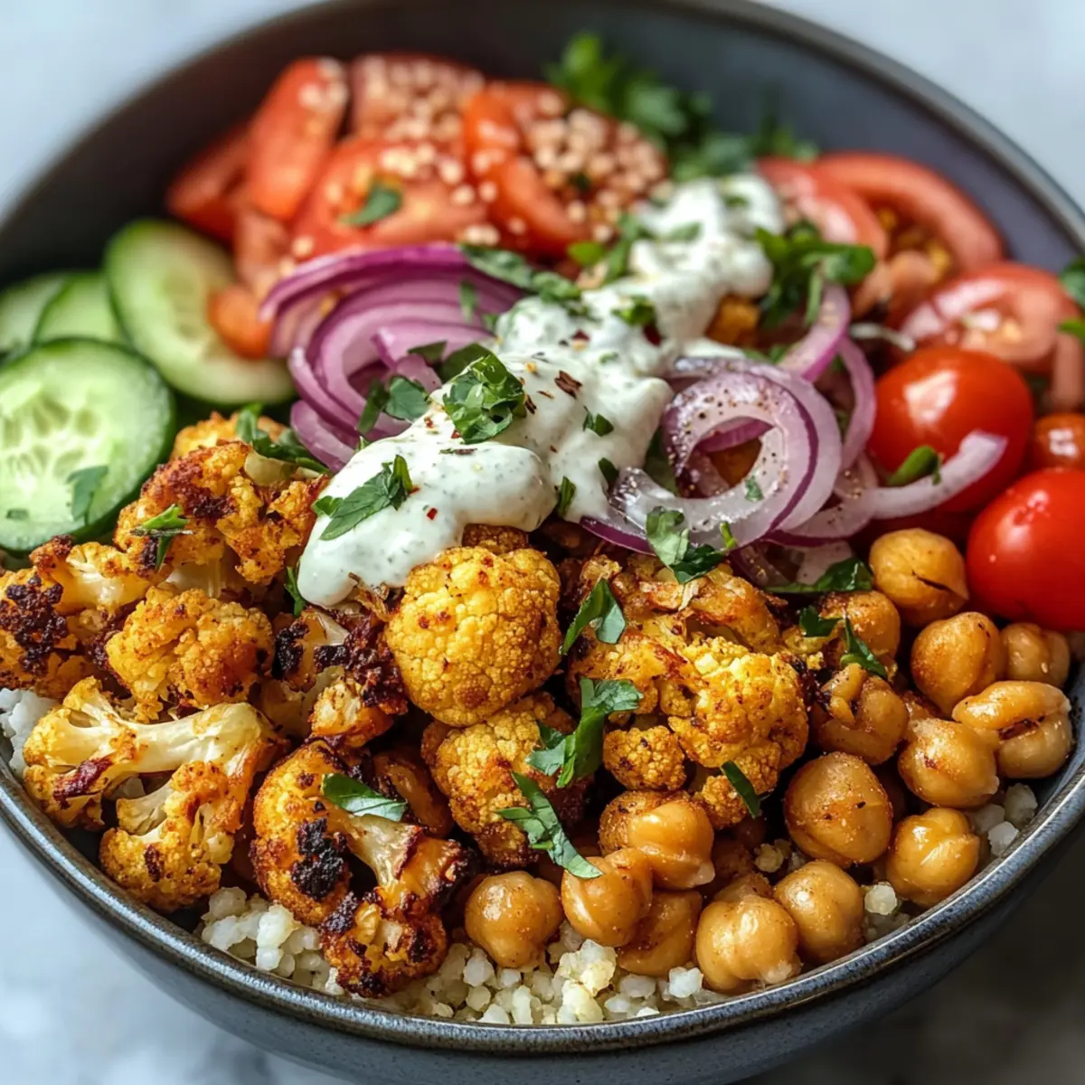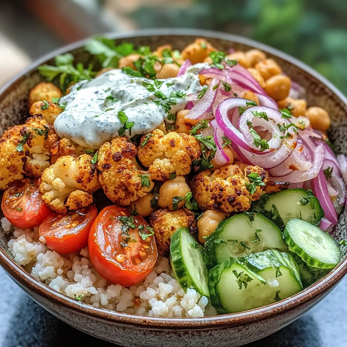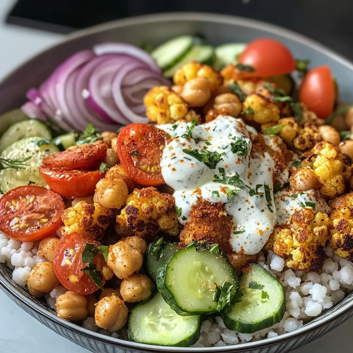 - Stelle die Blumenkohl Shawarma Schüssel zusammen mit Couscous, geröstetem Gemüse, Gurkenscheiben, Kirschtomaten und roten Zwiebeln.