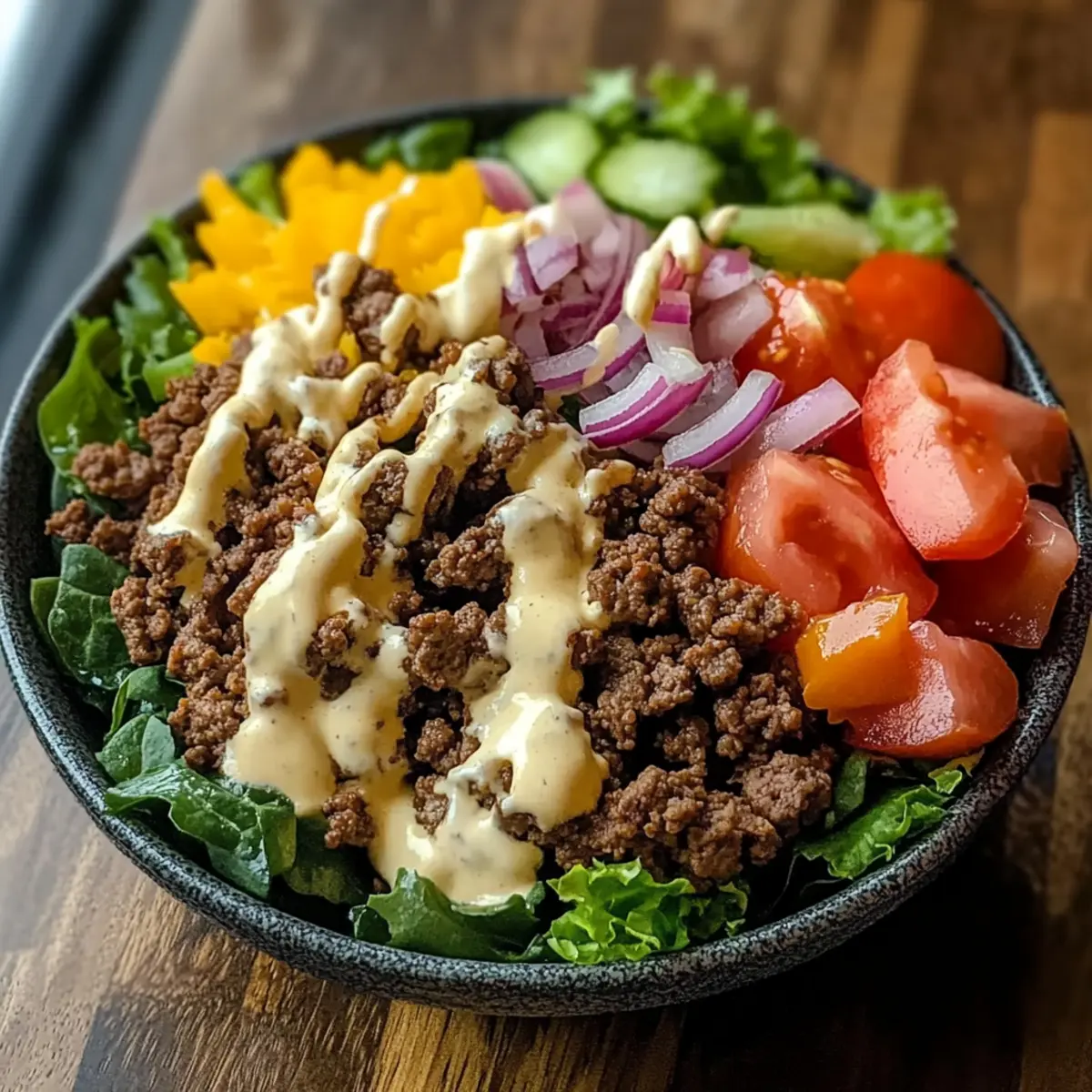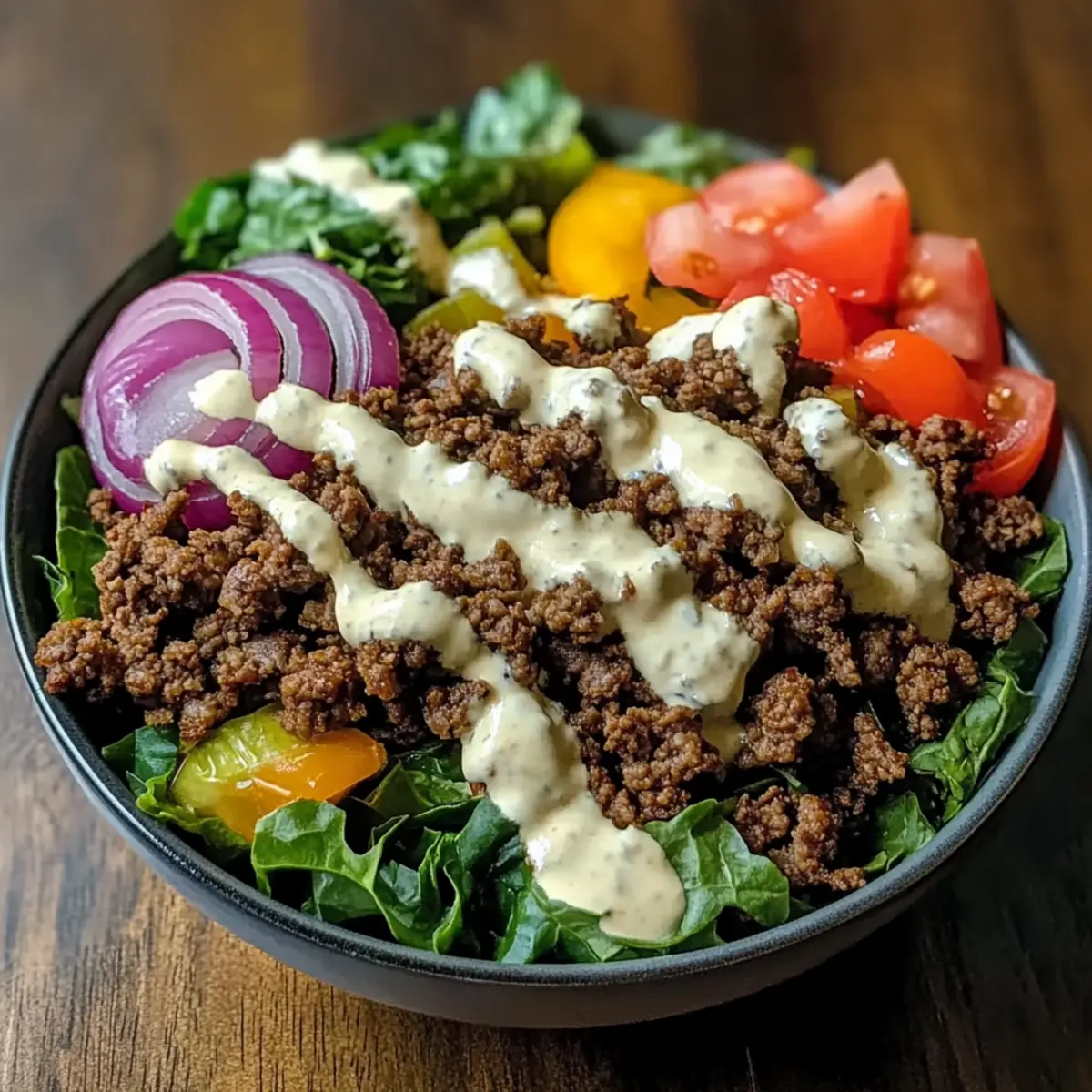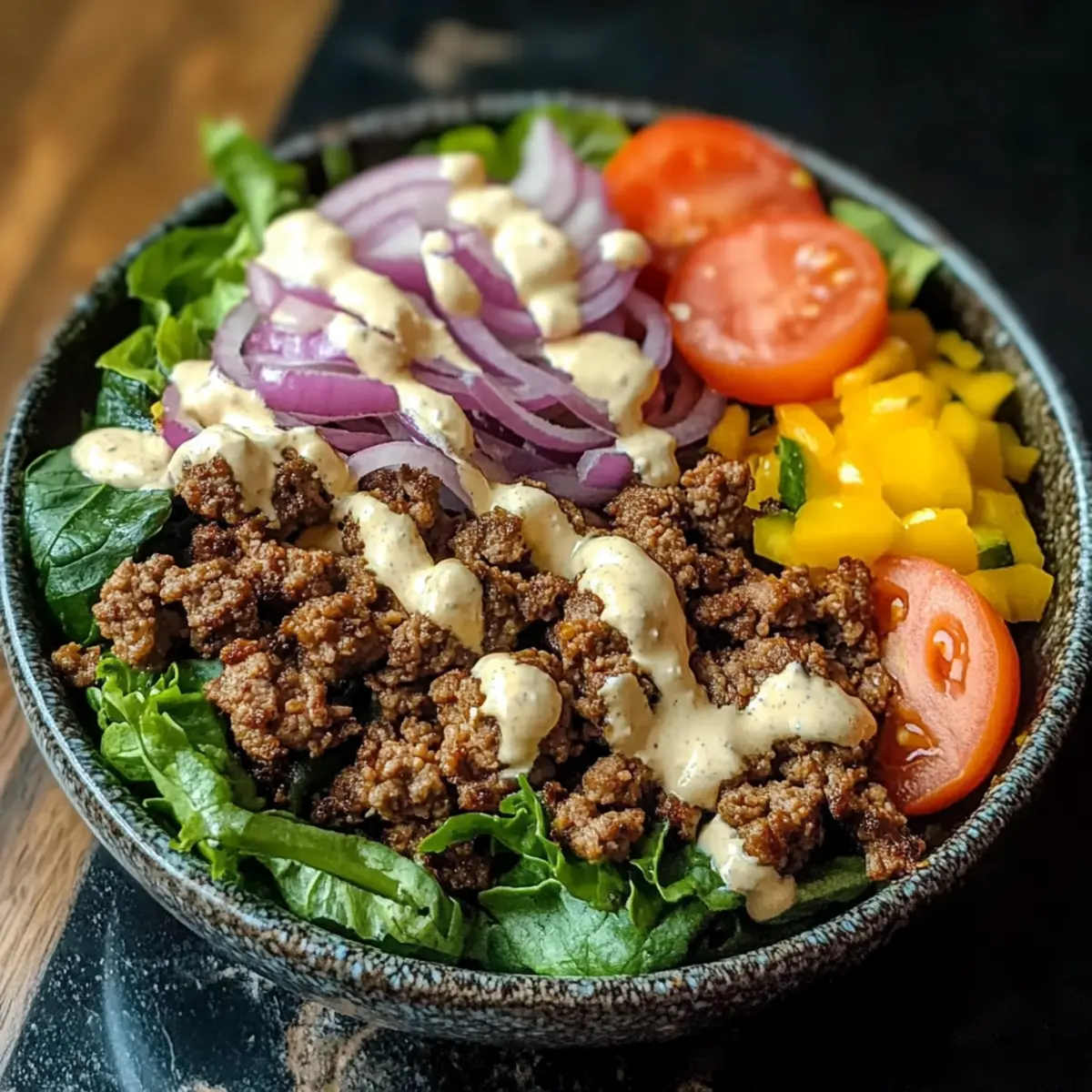 Nimm eine großzügige Schüssel und beginne mit einer Schicht Blattgemüse als Basis. Dann füge eine Handvoll frisches Gemüse wie gehackte Zwiebeln, Tomaten und Gurken hinzu. Löffle die Hälfte der gebratenen Fleischmischung über das Gemüse und drizzle die cremige Sauce großzügig darüber. Wiederhole die Schichten, wenn du mehrere Burger-Schalen zubereitest.