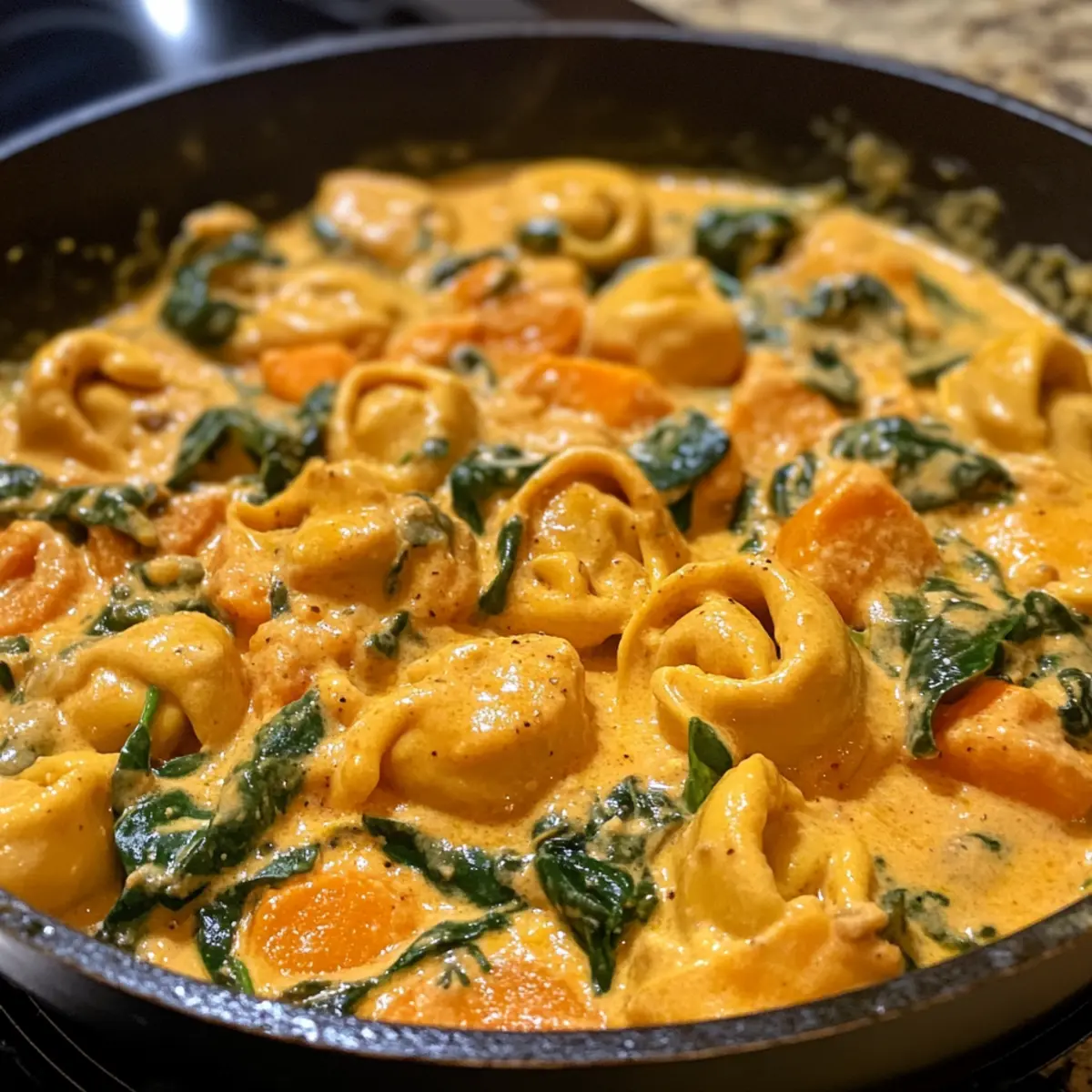 Cremige Pfannen-Tortellini mit Süßkartoffel und Spinat