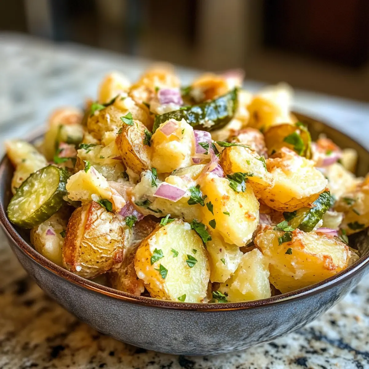 Knuspriger Zerdrückter Kartoffelsalat mit Crunchy Pickles