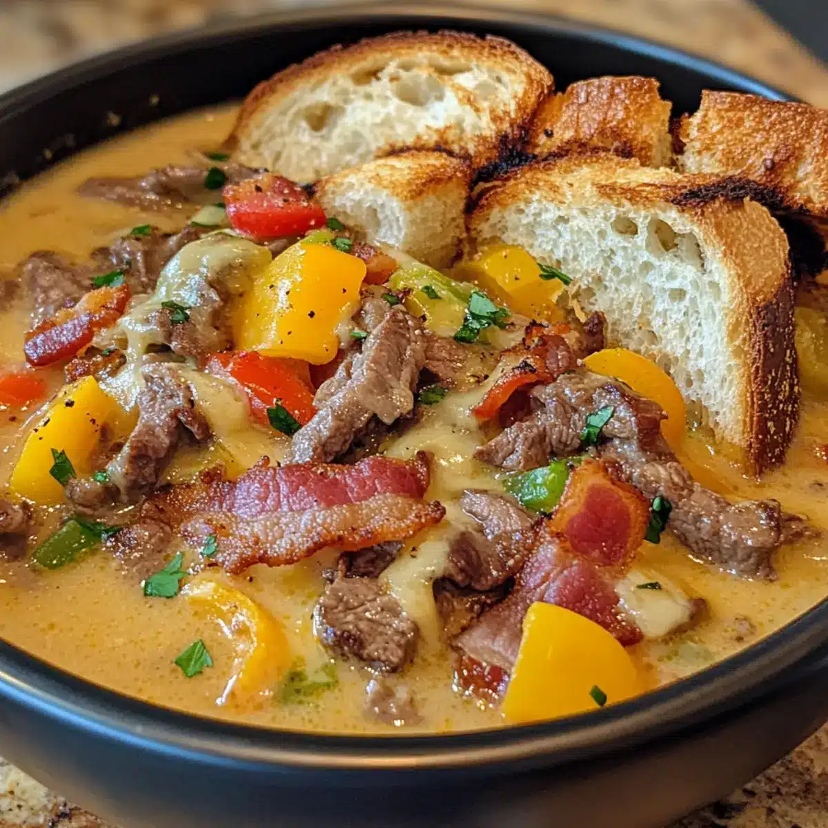 Käse-Steak-Suppe mit Speck und käsigem Toast