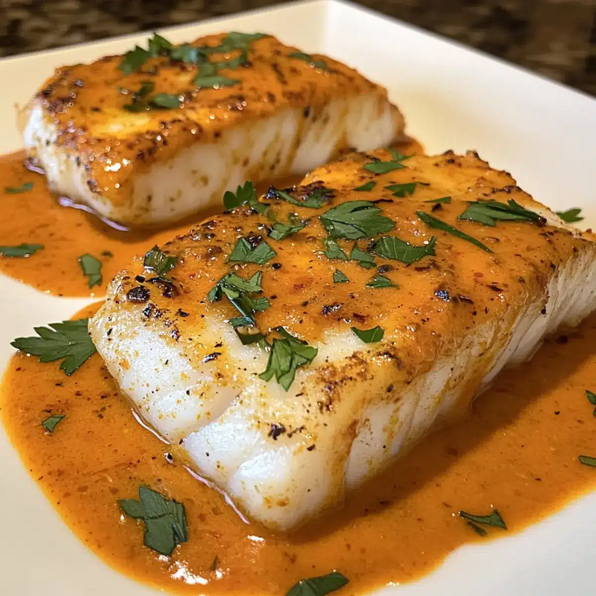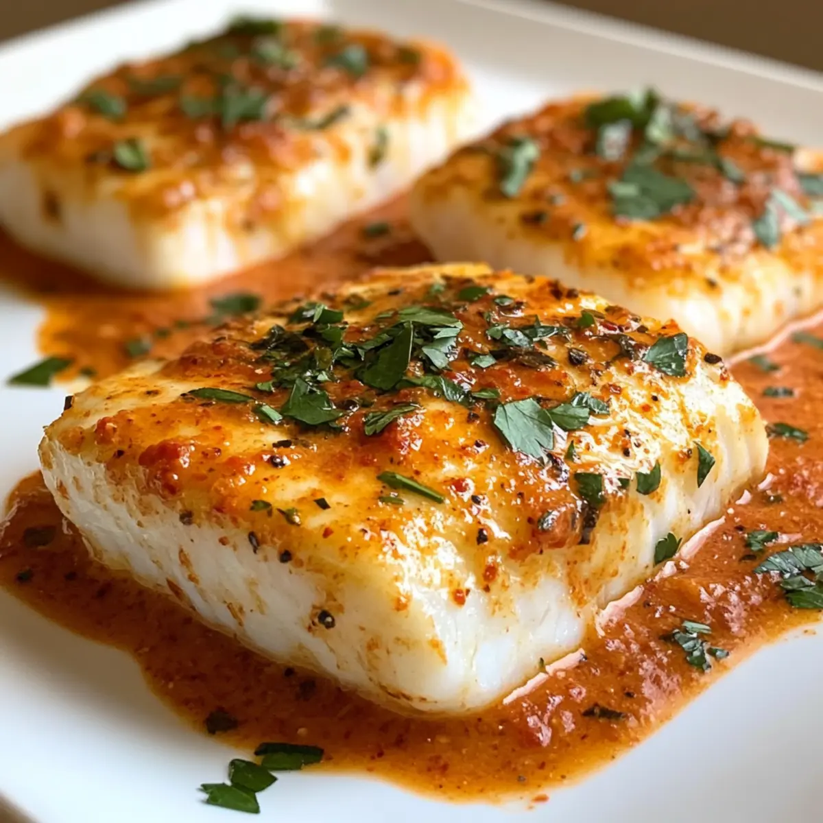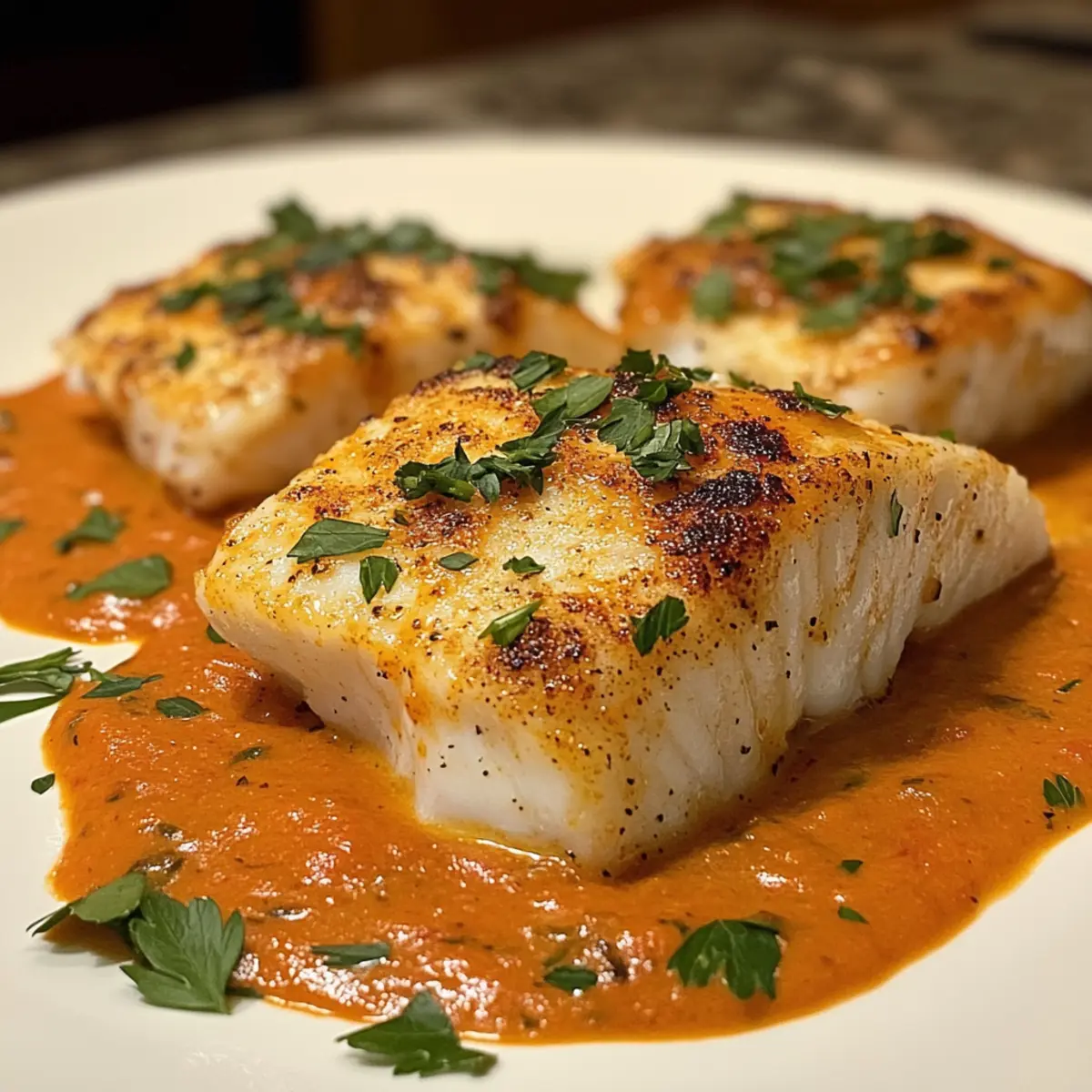 - Serviere die Cod in gerösteter Paprikasoße sofort.