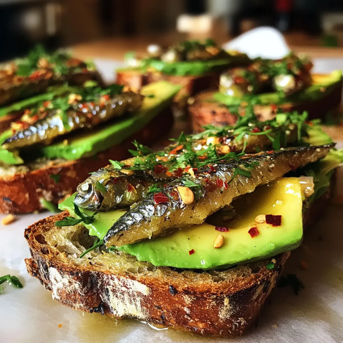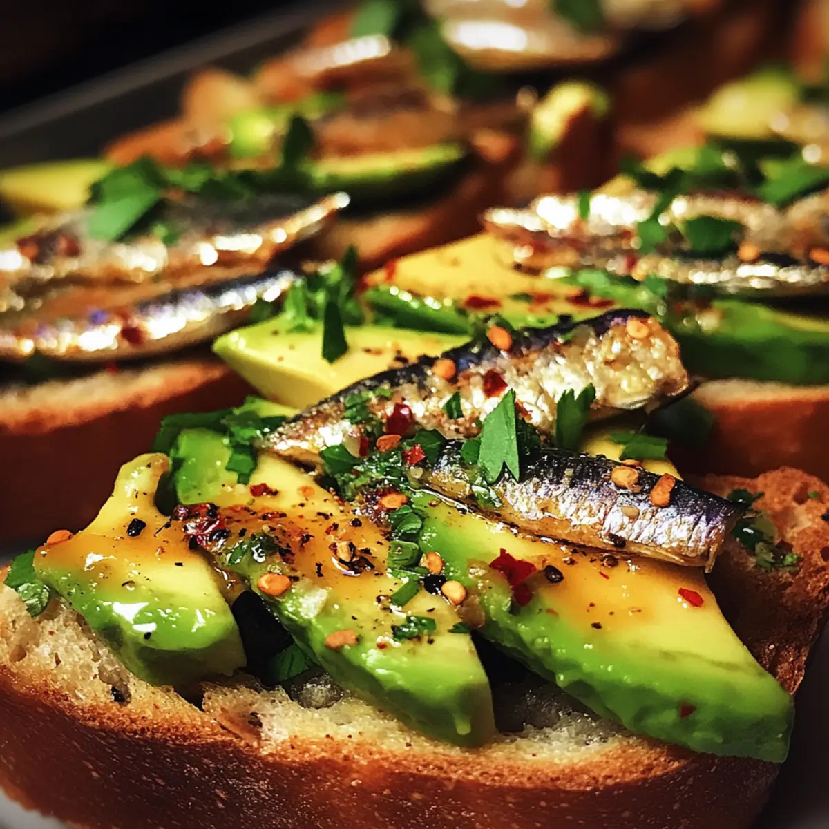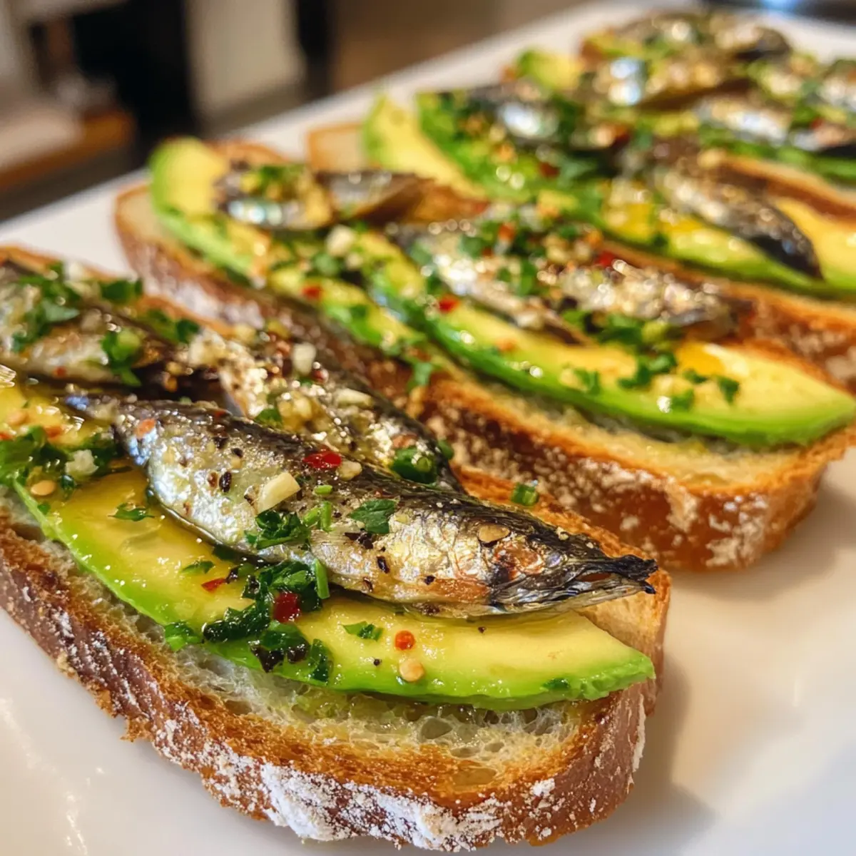 Öffne die Dose mit hochwertigen Dosen-Sardinen und lasse das Öl abtropfen, während du ein wenig davon aufbewahrst. Füge etwas Zitronensaft, rote Pfefferflocken und frisch gemahlenen schwarzen Pfeffer hinzu. Vorsichtig umrühren, damit sich die Aromen entfalten können, bevor du sie auf deinen Avocado-Toasts platzierst.