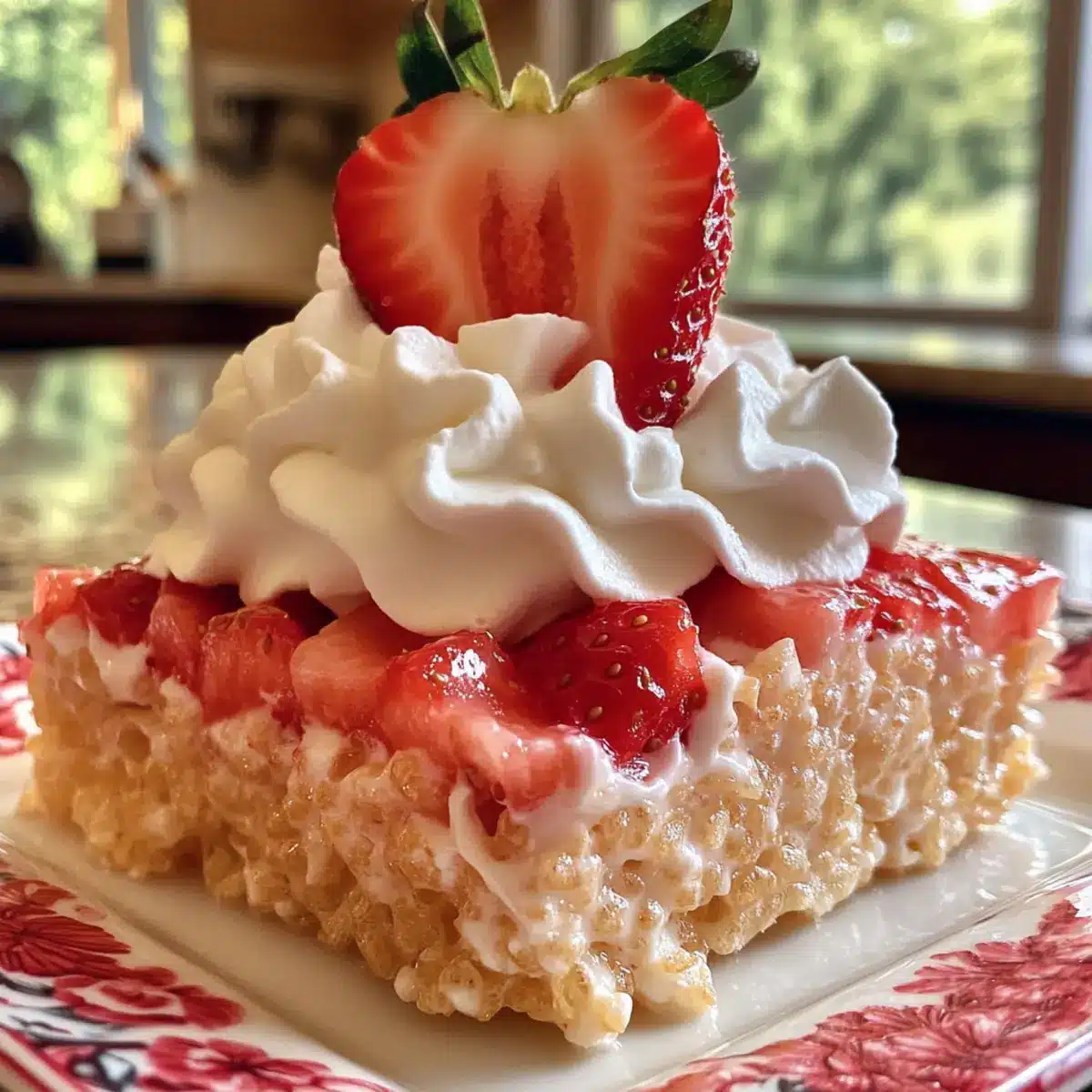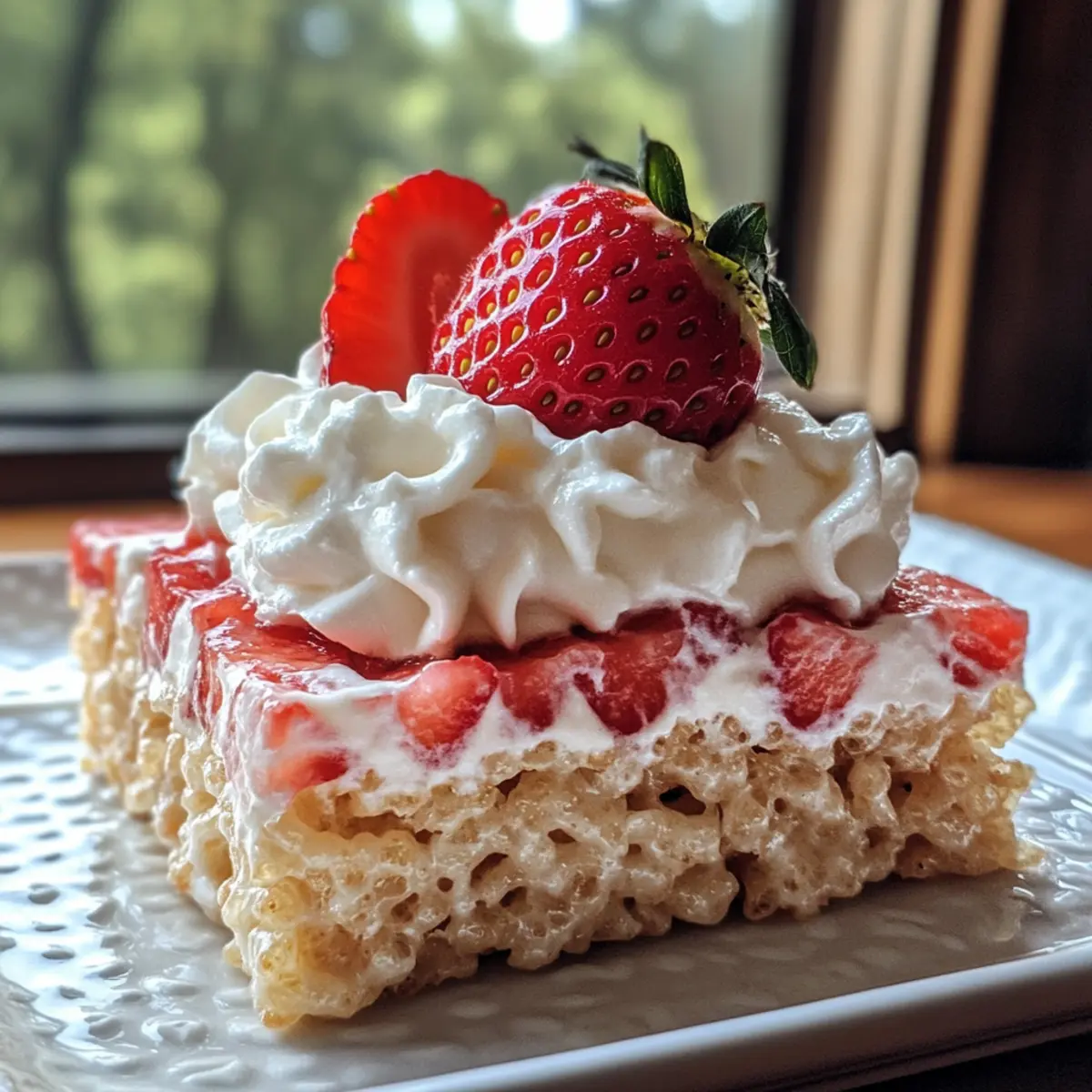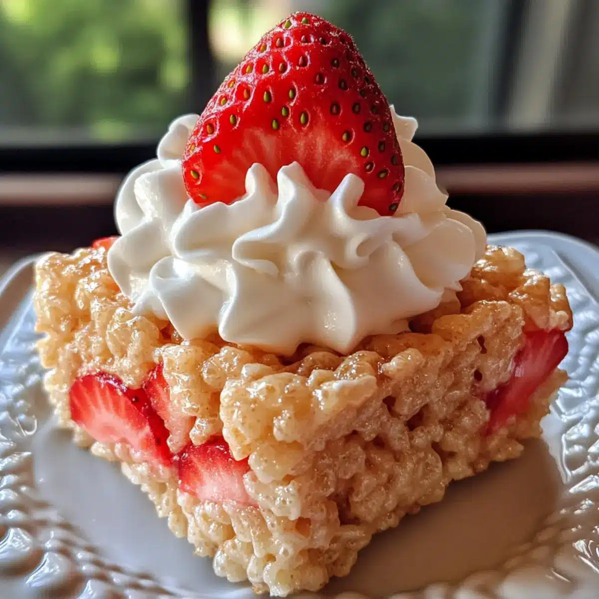 Schneide die fest gewordenen Krispies in gleichmäßige Quadrate oder Rechtecke. Garniere sie nach Wunsch mit frischen Erdbeeren und einem Klecks Schlagsahne für das perfekte Finish. Diese hübschen Snacks sind nun bereit, serviert zu werden!
