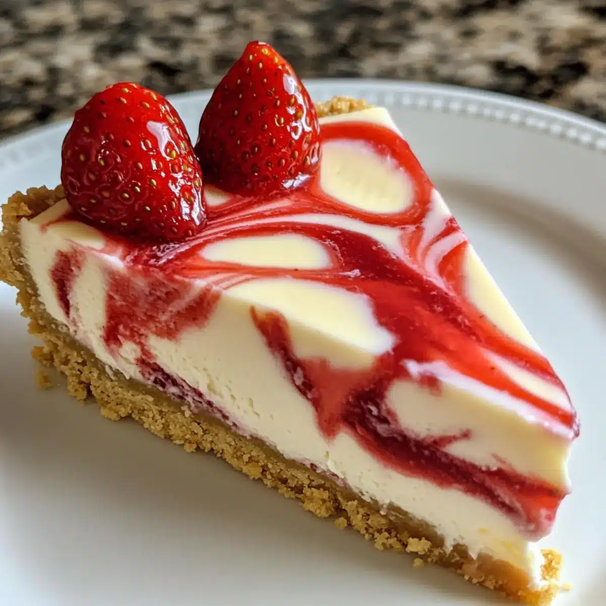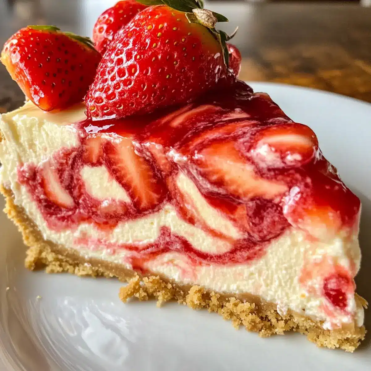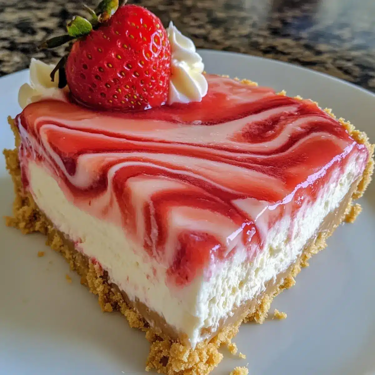 Gießen Sie die Hälfte der Käsekuchenfüllung gleichmäßig auf die bereits ausgekühlte Kruste. Setzen Sie kleine Kleckse der Erdbeersoße darauf und verwenden Sie einen Zahnstocher, um die Füllung leicht zu marmorieren. Die restliche Käsekuchenfüllung vorsichtig darauf geben und erneut SWIRL mit weiteren Kleksern der Erdbeersoße, um eine schöne Optik zu schaffen.
