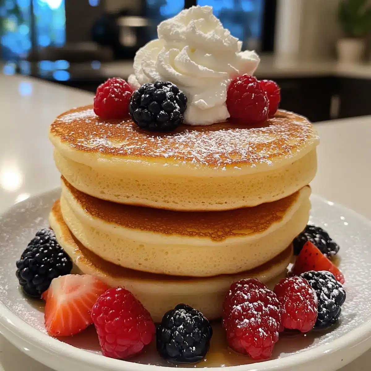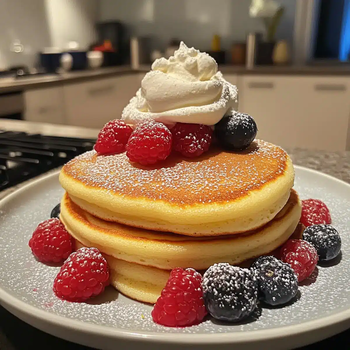 - Serviere die Pfannkuchen sofort, garniert mit süßer Schlagsahne, frischen Beeren, Puderzucker oder Ahornsirup.