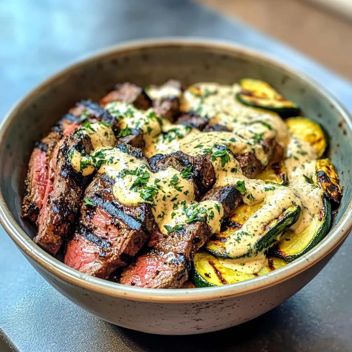 Beginne mit einer Basis aus gekochtem Reis oder Kartoffelpüree in einer großen Schüssel. Füge dann die gegrillte Zucchini und das in Scheiben geschnittene Steak dazu. Zum Schluss drizzlest du die cremige Sauce über die Schüssel, um das Gericht abzurunden und den genussvollen Geschmack der Gegrillten Steak-Schüssel mit Sauce zu genießen.