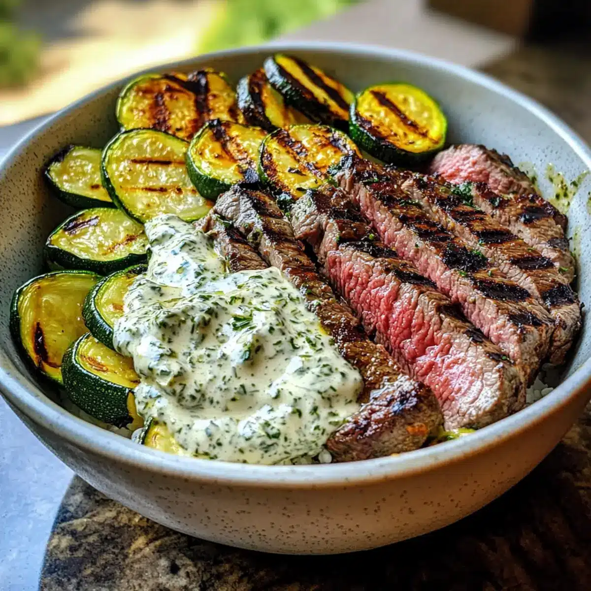 - Schüssel anrichten: Beginne mit Reis oder Kartoffelpüree, füge die gegrillte Zucchini und Steak hinzu und drizzlere die Sauce darüber.