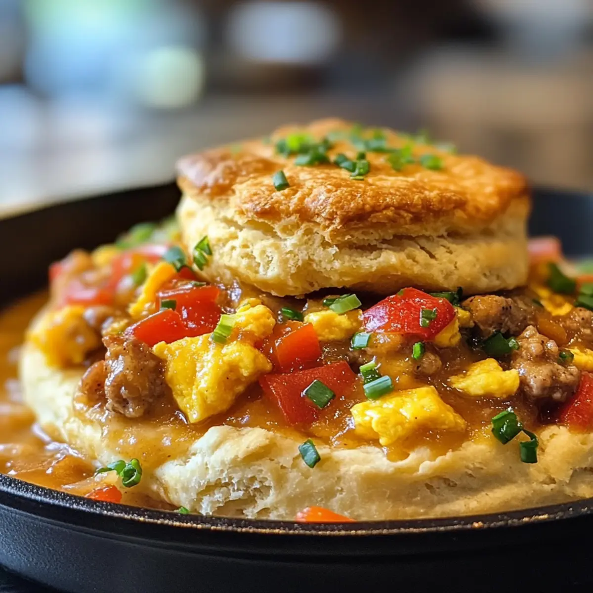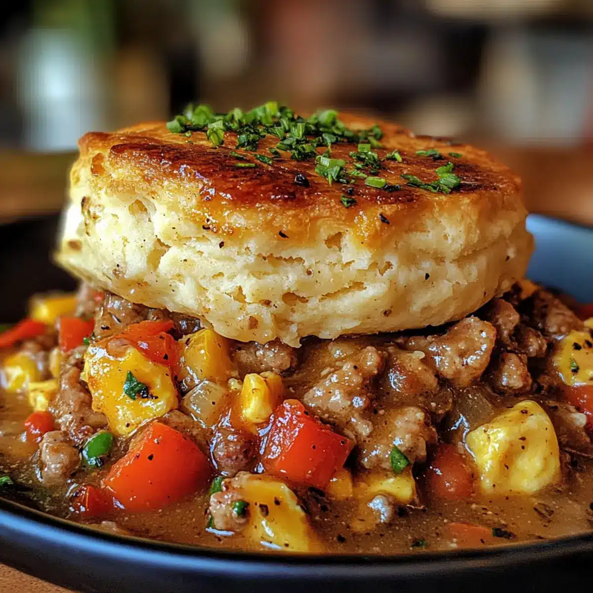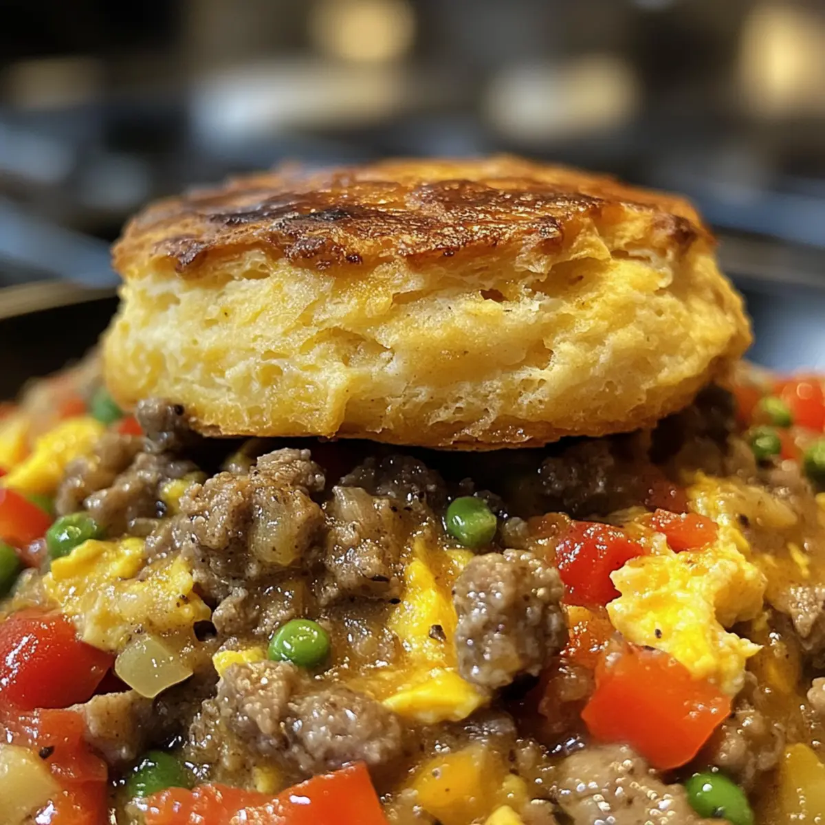 Heize den Ofen auf 220 °C (425 °F) vor. Fülle kleine ofenfeste Schalen (Ramekins) mit den Rühreiern, dem gebratenen Gemüse, dem Cheddar-Käse und der Wurstsoße. Achte darauf, dass die Füllung gut verteilt ist, bevor du den Biscuit-Teig gleichmäßig darauf verteilst.
