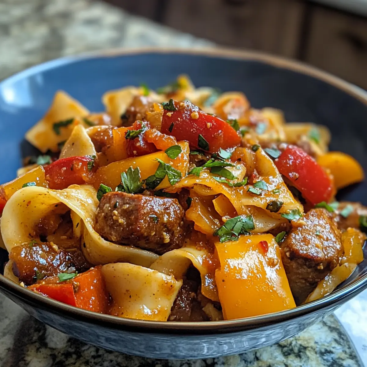 Gib die gebratene Wurst zurück in die Pfanne und lasse die Soße etwa 8–10 Minuten lang bei mittlerer Hitze köcheln, damit sich die Aromen verbinden. Sobald die Soße eingedickt ist, füge die abgetropften Nudeln hinzu und vermische alles gründlich, dabei nach Bedarf etwas von dem reservierten Nudelwasser hinzuzufügen, um die Soße cremiger zu machen.