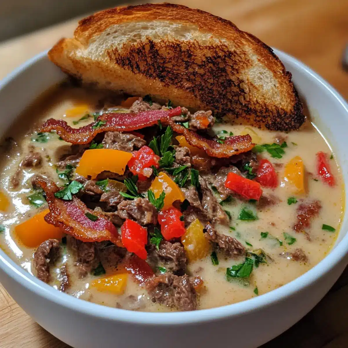 Käse-Steak-Suppe mit Speck und käsigem Toast