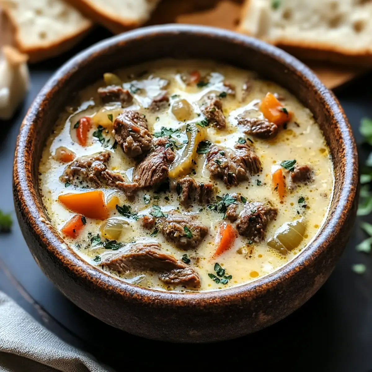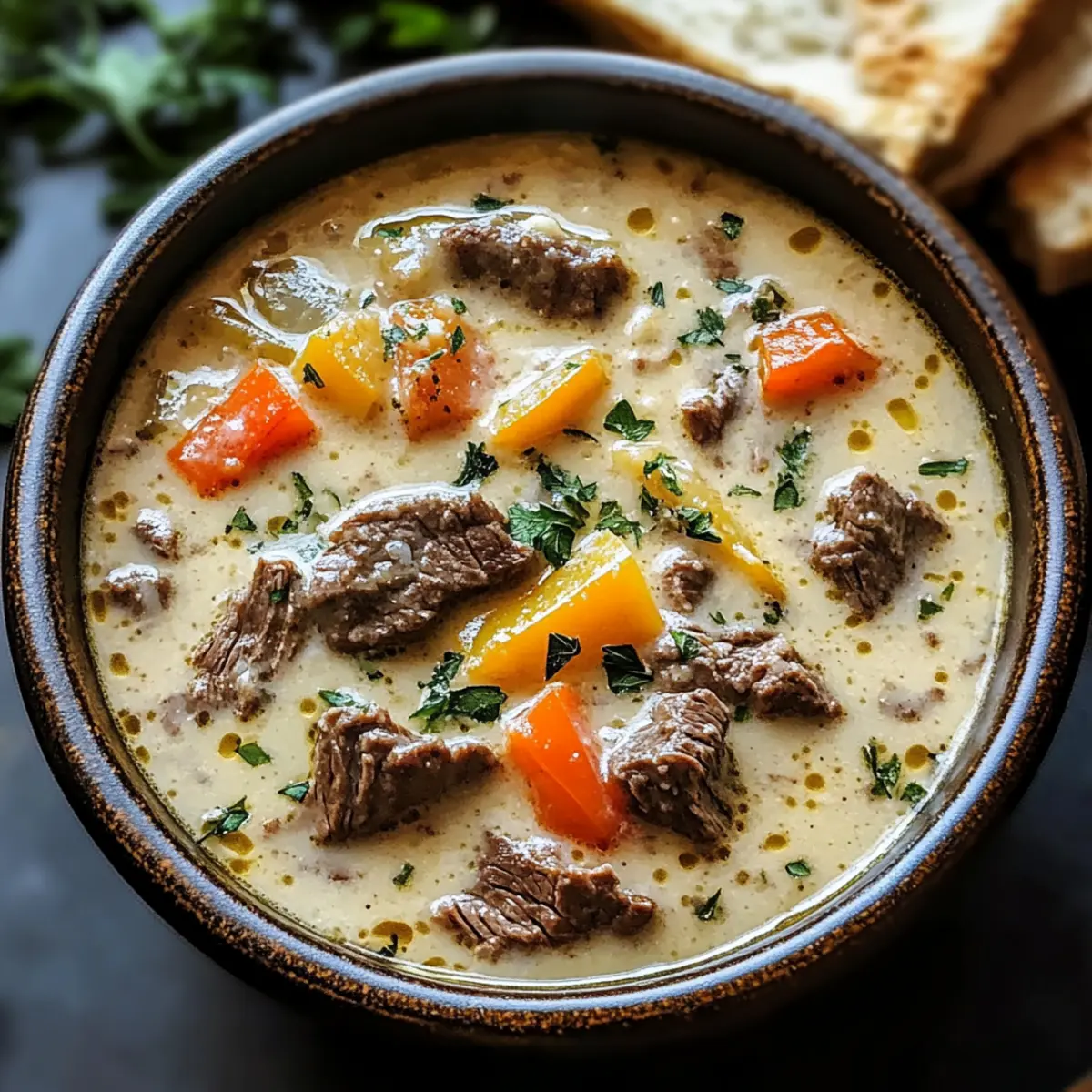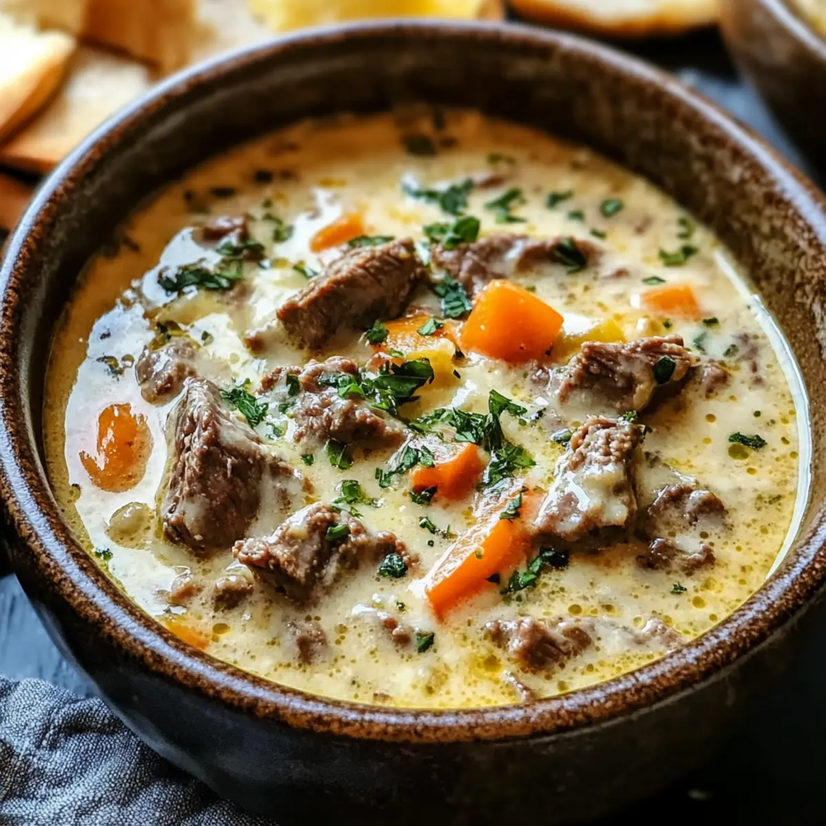 Vielseitigkeit: Die Käse Steak Suppe lässt sich mühelos an verschiedene Ernährungsweisen anpassen, sei es glutenfrei, leicht oder sogar vegetarisch. Schnelligkeit: In weniger als 30 Minuten servierfertig, ideal für einen hektischen Wochentag. Reiche Aromen: Die Kombination aus zartem Rinderfilet und der cremigen Provolone-Sauce sorgt für ein unvergleichliches Geschmackserlebnis. Einfachheit: Die Zubereitung erfordert keine aufwendigen Techniken, perfekt für Kochanfänger und Profis! Geselligkeit: Diese Suppe ist ein absoluter Hit bei Gästen und verwandelt jedes Essen in ein besonderes Event. Bereite sie mit einem frischen Salat oder knusprigem Brot zu und erlebe den ultimativen Komfort!