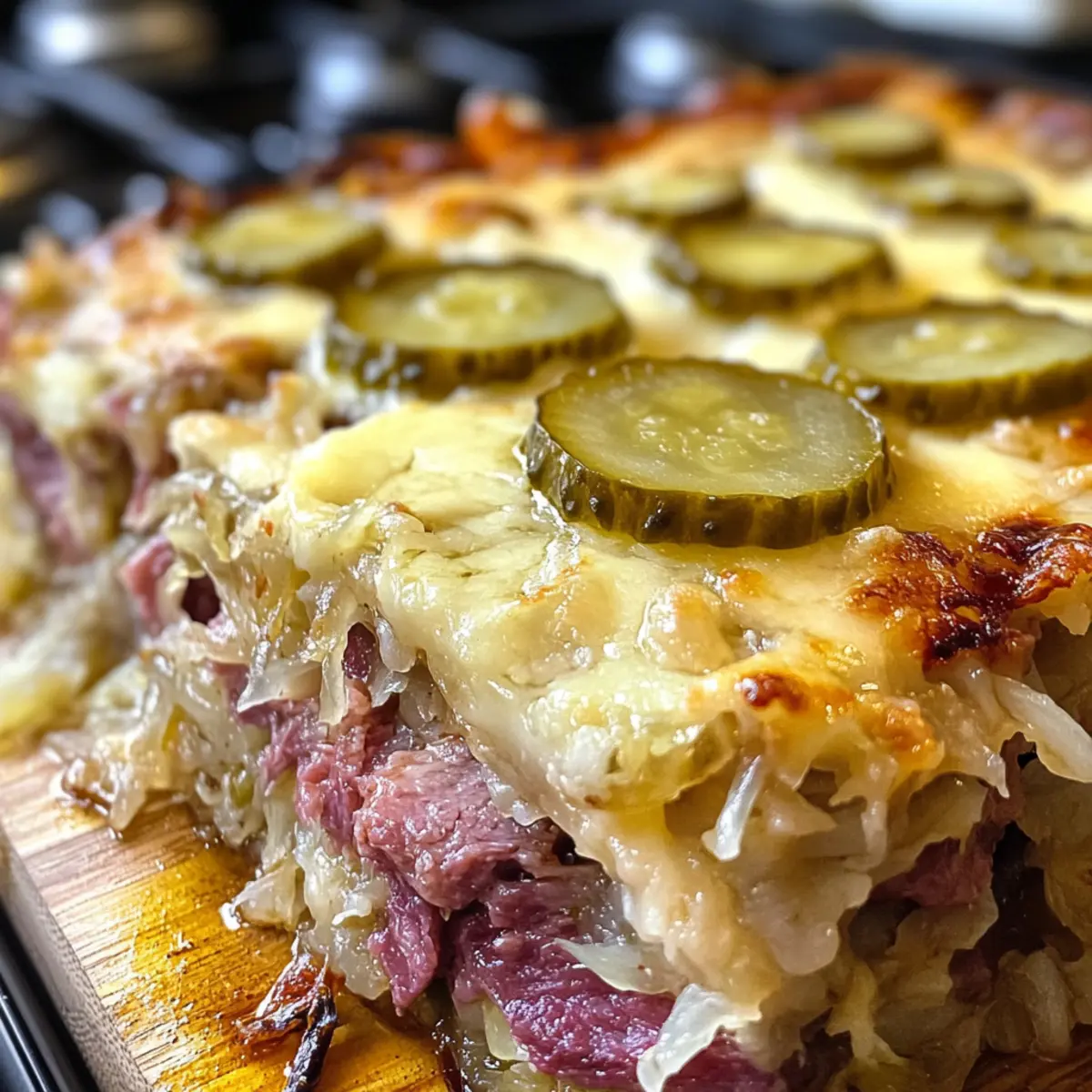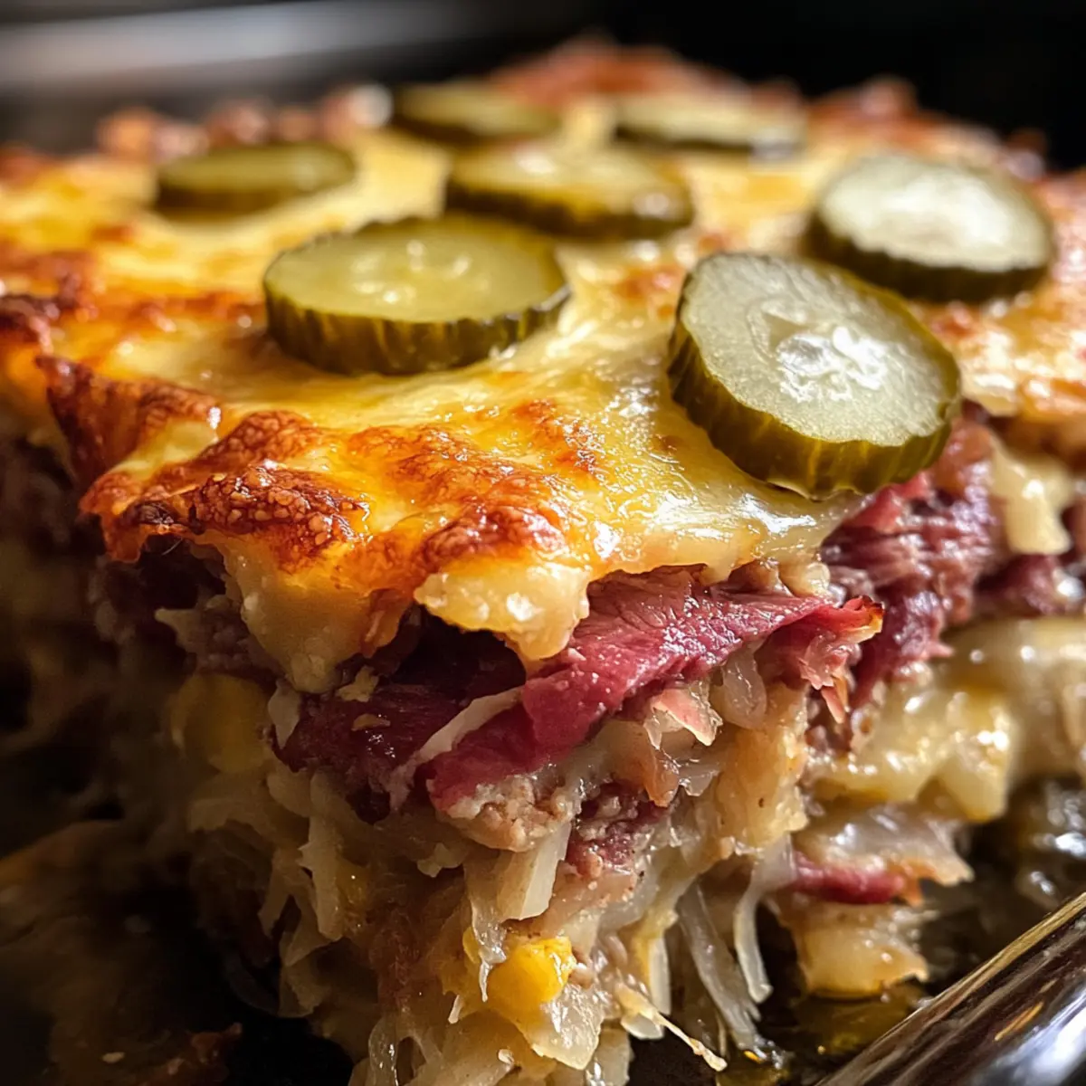 Verteile eine Schicht des abgetropften Sauerkrauts und der gewürfelten Dillgurken gleichmäßig über das Corned Beef. Die Kombination aus säuerlichem Sauerkraut und knusprigen Gurken sorgt für einen wunderbaren Kontrast und verstärkt die Authentizität des Reuben-Geschmacks in diesem Auflauf.
