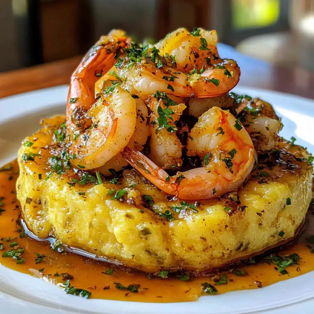 - Forme das Mofongo auf einem Teller, lege die Garnelen darauf und träufle die Bratensäfte darüber.