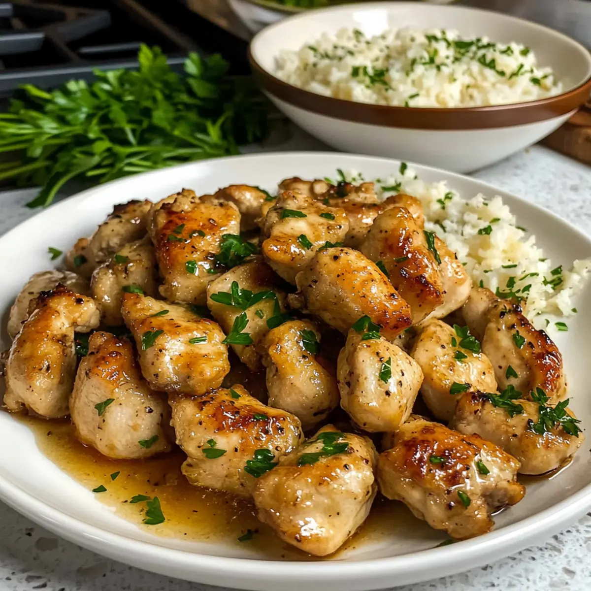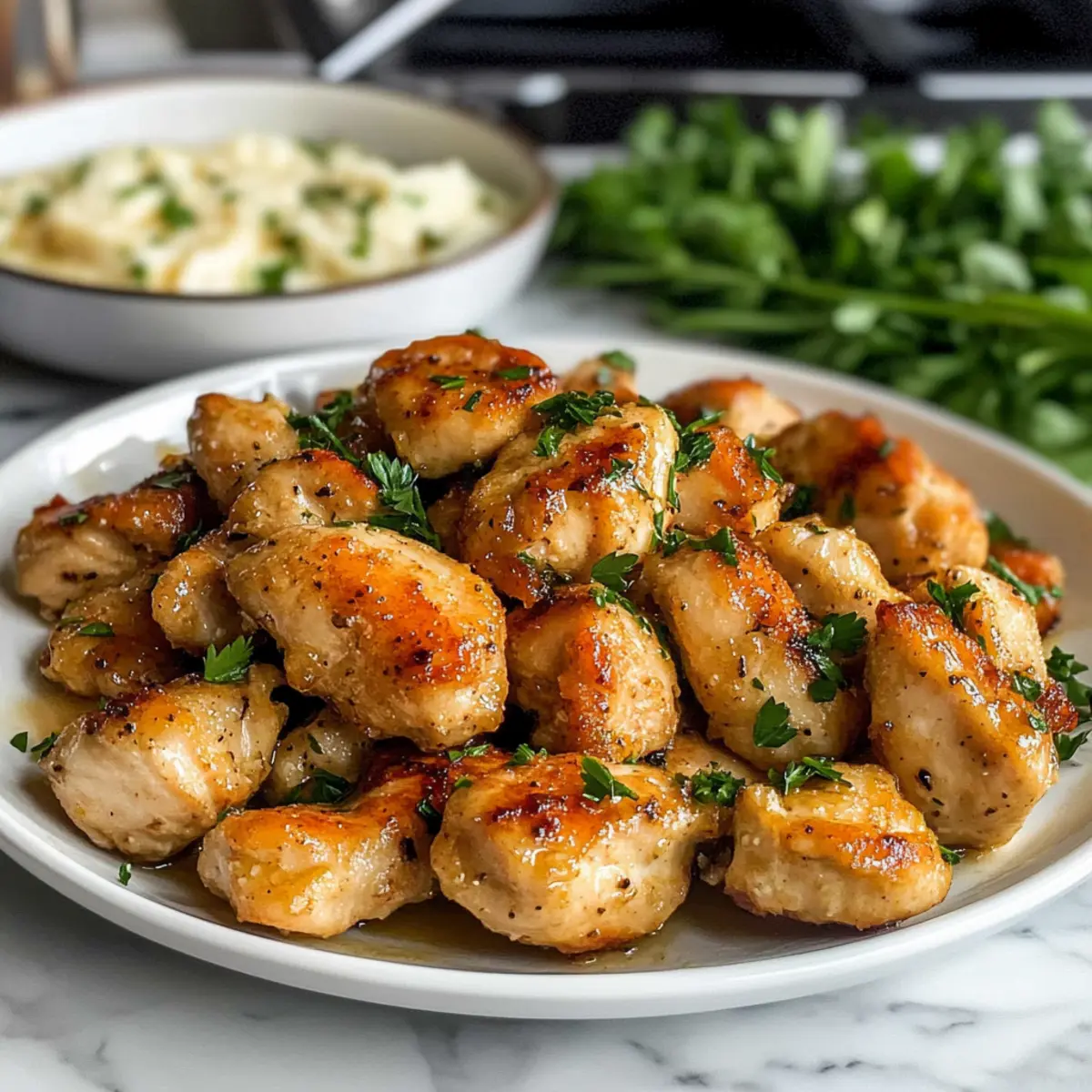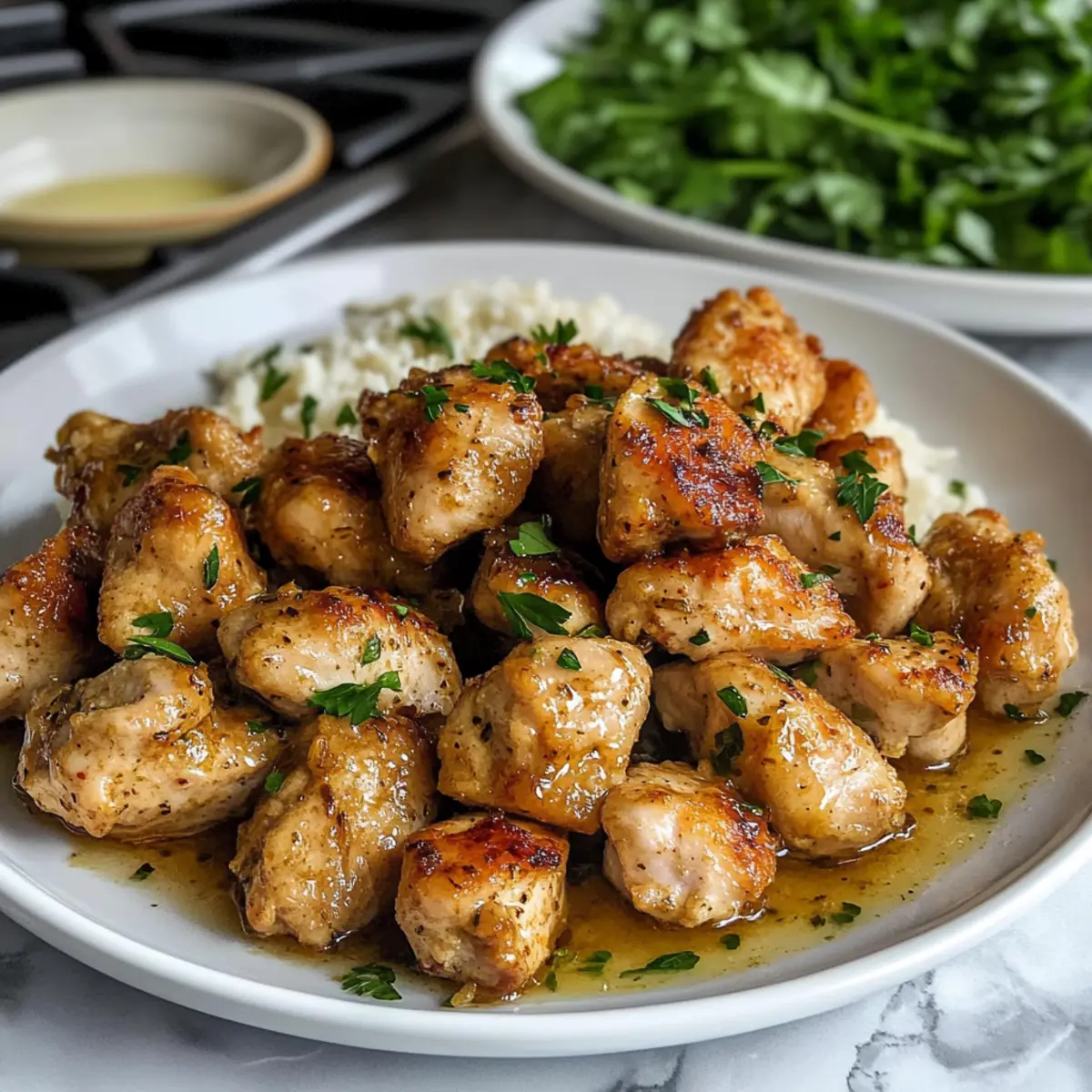 Erfreuen Sie sich an diesen Knoblauchbutter-Hühnchenbissen, ideal für ein schnelles, proteinreiches Abendessen!