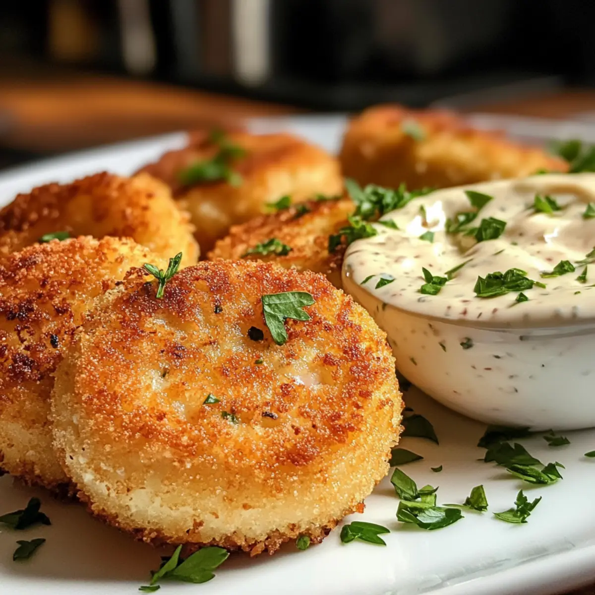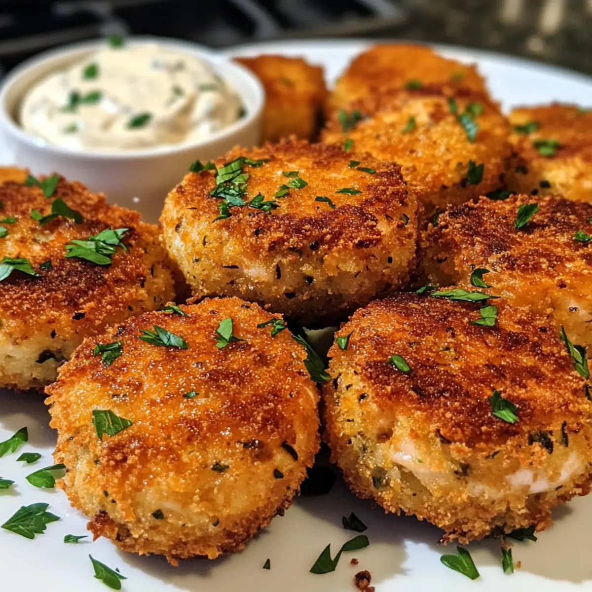 Sobald die knusprigen pfannenfrittierten Lachs-Kroketten leicht abgekühlt sind, serviere sie warm auf einem Teller. Garniere sie mit frisch gehackter Petersilie und serviere die Remoulade zum Dippen dazu. Diese knusprigen Köstlichkeiten sind perfekt für jedes Treffen und werden von deiner Familie und deinen Freunden geliebt werden!