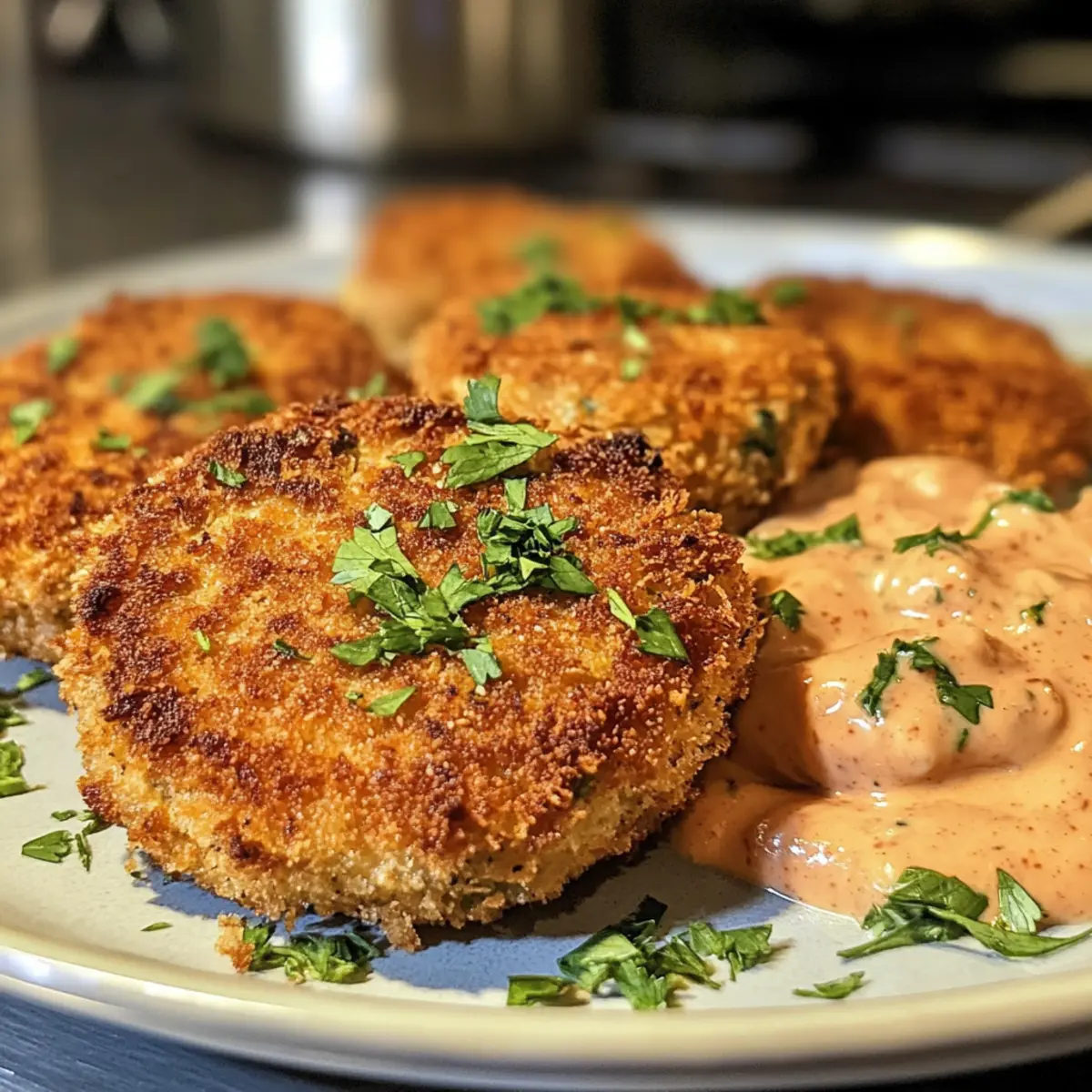 Lass die fertig gebratenen Kroketten kurz auf Küchenpapier abtropfen, um überschüssiges Öl zu entfernen. Garniere sie mit frischer Petersilie für einen Farbtupfer und serviere die knusprigen Pfannengerührten Lachs-Kroketten heiß zusammen mit der Remoulade-Sauce. Sie sind perfekt für ein schnelles Abendessen oder als schmackhafter Snack für deine Gäste.