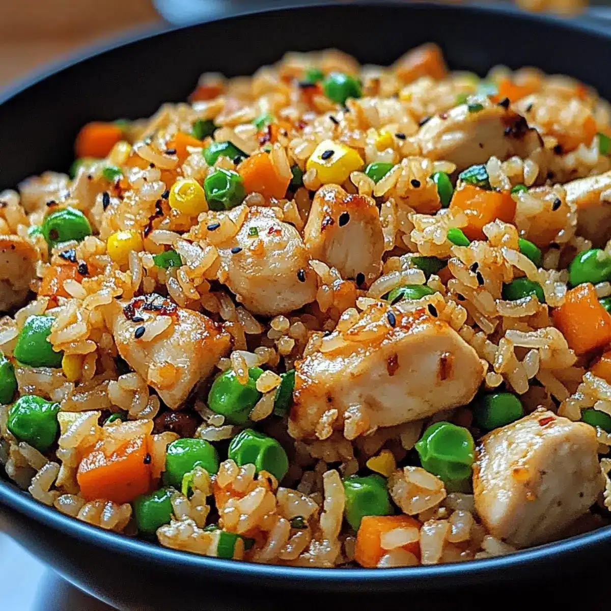 Garnieren den Knusprigen Knoblauch-Hühnchen gebratenen Reis mit gehackten Frühlingszwiebeln und optionalen Sesamsamen. Serviere das Gericht sofort, damit die knusprige Textur erhalten bleibt. Genieße diese köstliche und proteinreiche Mahlzeit direkt aus der Pfanne!
