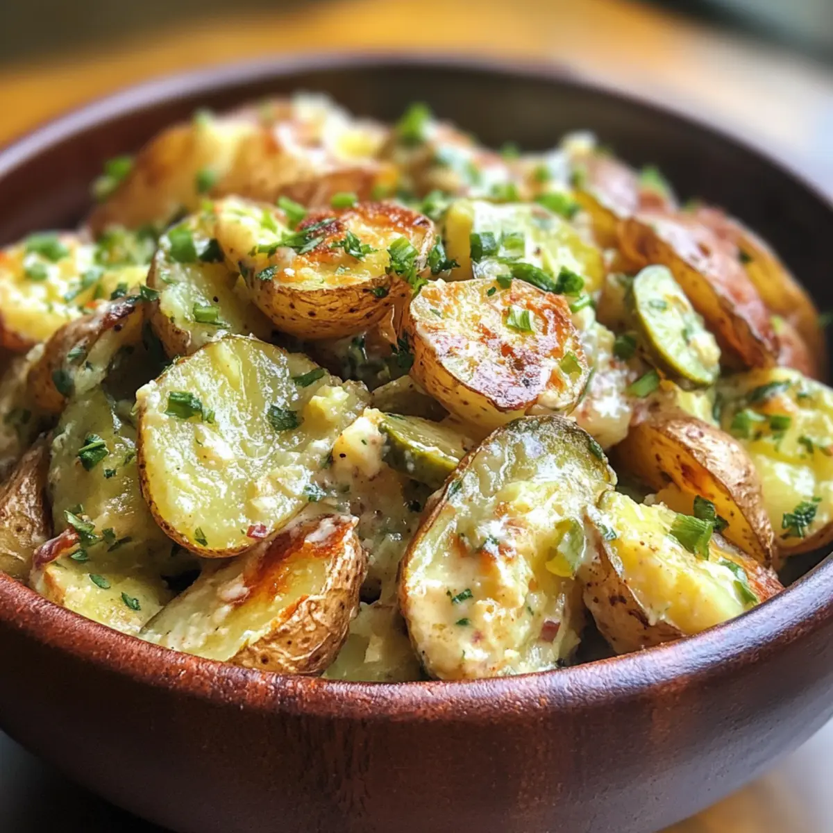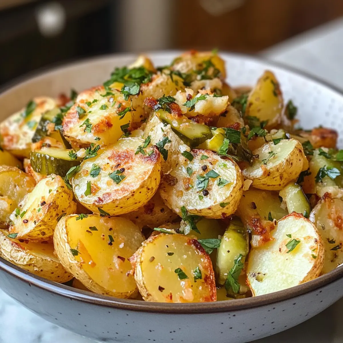 Als ich neulich bei einem Grillabend war, hörte ich, wie jemand über die langweiligen Kartoffelsalate klagte, die immer wieder serviert werden. Genau in diesem Moment kam mir die Idee zu meinem Knusprigen Zerdrückten Kartoffelsalat. Diese Version bringt einen verwöhnenden Crunch, der selbst die eingefleischtesten Kartoffelsalat-Fans begeistern wird. Die goldbraunen, knusprigen Kartoffeln, kombiniert mit einer cremigen, herzhafteren Sauce und dem unerwarteten Kick von knackigen Essiggurken, verwandeln ein klassisches Gericht in etwas wirklich Besonderes. Ideal für deinen nächsten Potluck oder ein entspanntes BBQ, ist dieses Rezept eine wunderbare Möglichkeit, dich von der leidigen Fastfood-Routine zu verabschieden. Bist du bereit, die Karten auf den Tisch zu legen und etwas Neues auszuprobieren?