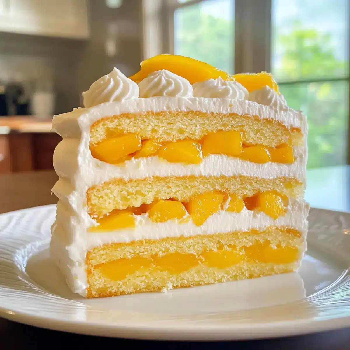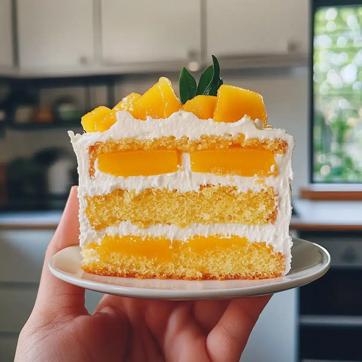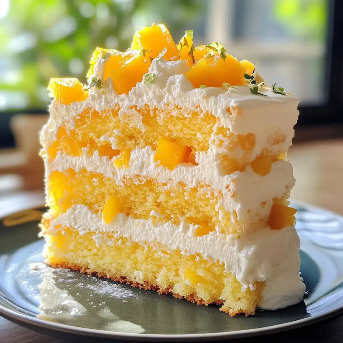 Nehme ein Kuchenstück und lege eine Schicht der Chantilly-Creme darauf, gefolgt von einer Schicht frischer Mango. Wiederhole diesen Vorgang mit den restlichen Kuchenstücken und achte darauf, die Schichten gleichmäßig zu stapeln. Jede Schicht bringt die tropischen Aromen in deinem Kuchen zur Geltung.