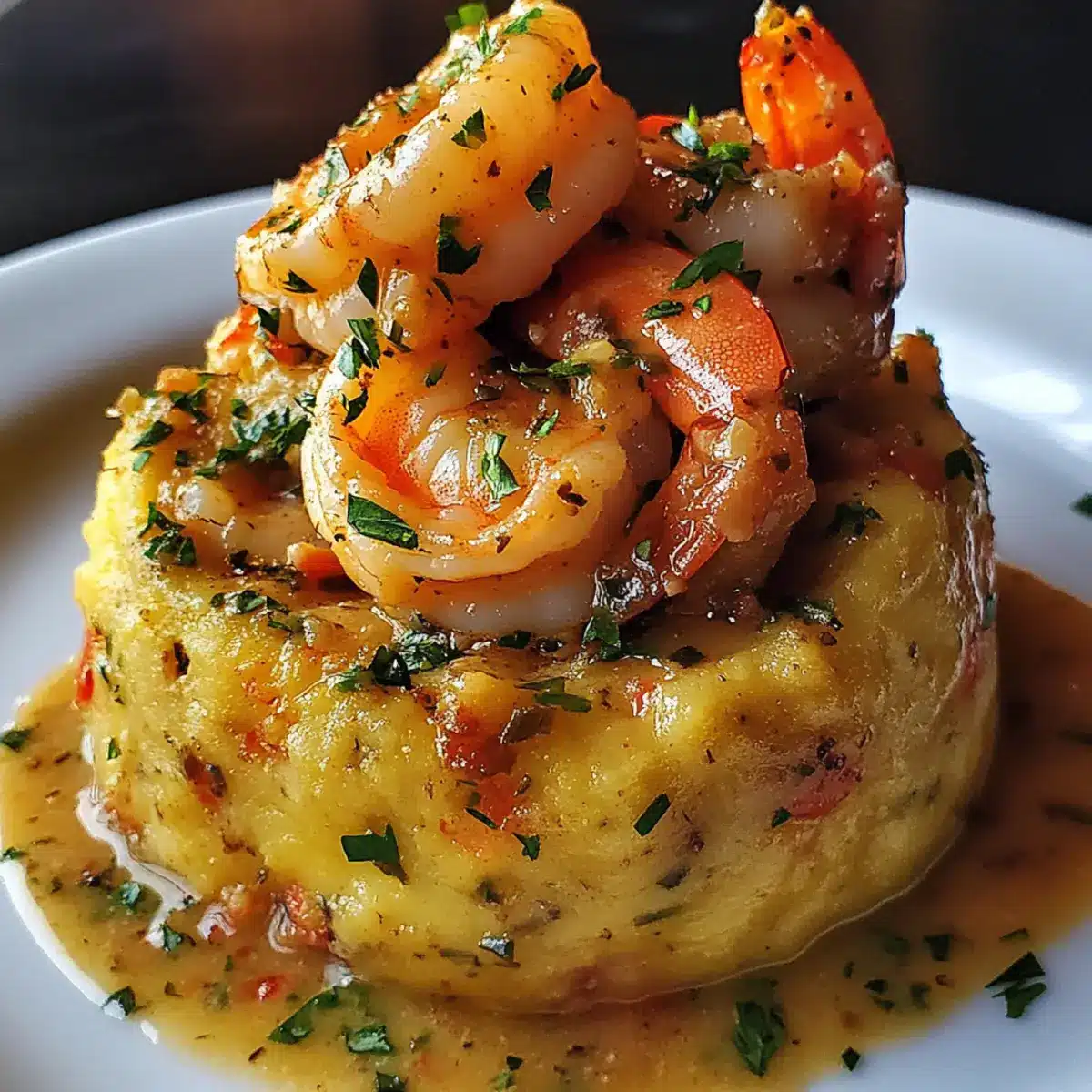 - Rühre den Zitronensaft und die gehackte Petersilie in die Soße ein. Formen nun das Mofongo auf einem Teller, lege die Garnelen darüber und gieße die Soße darüber.