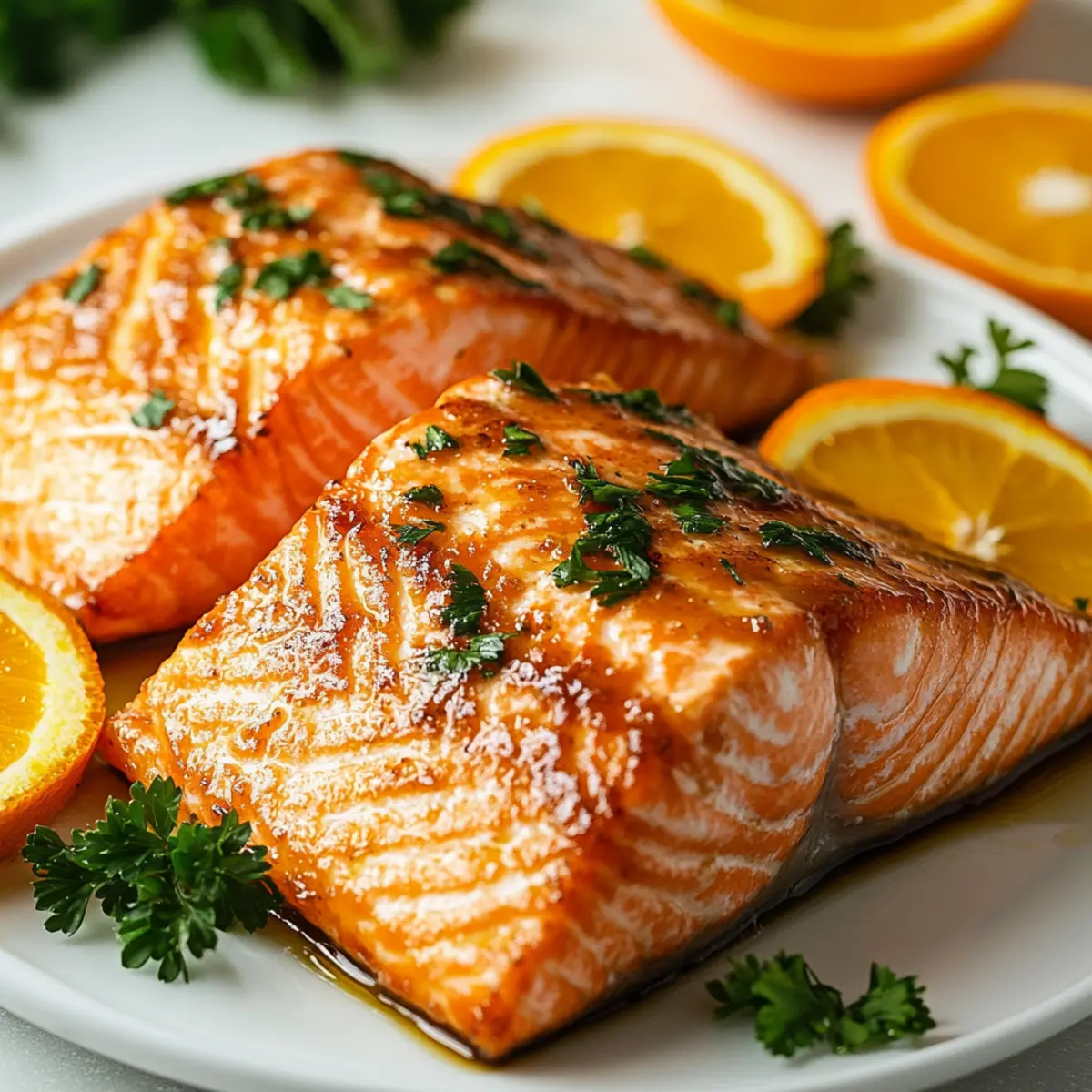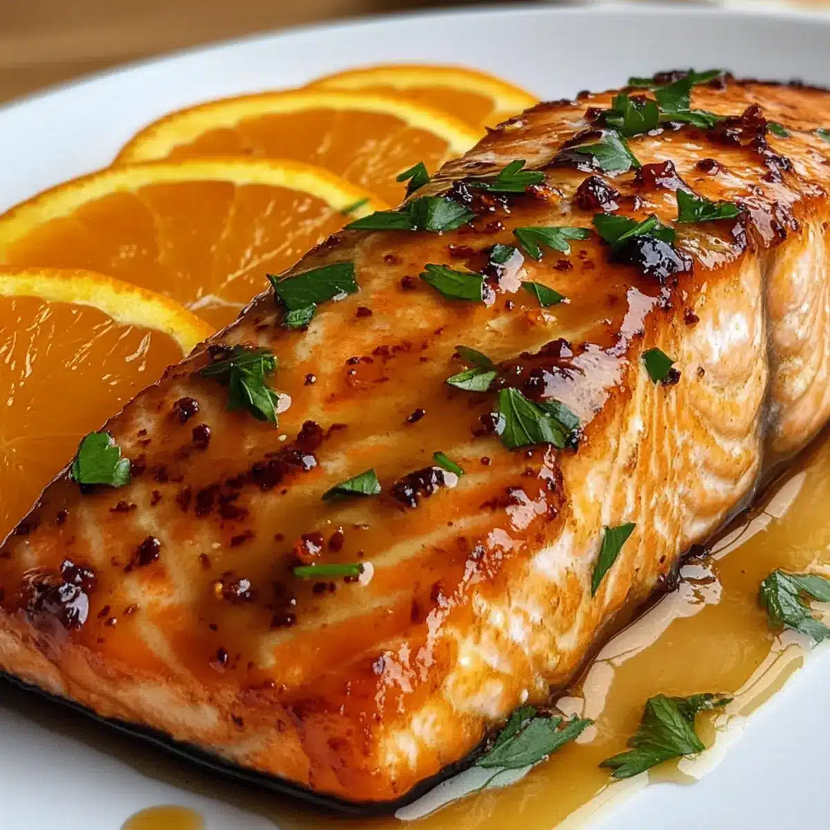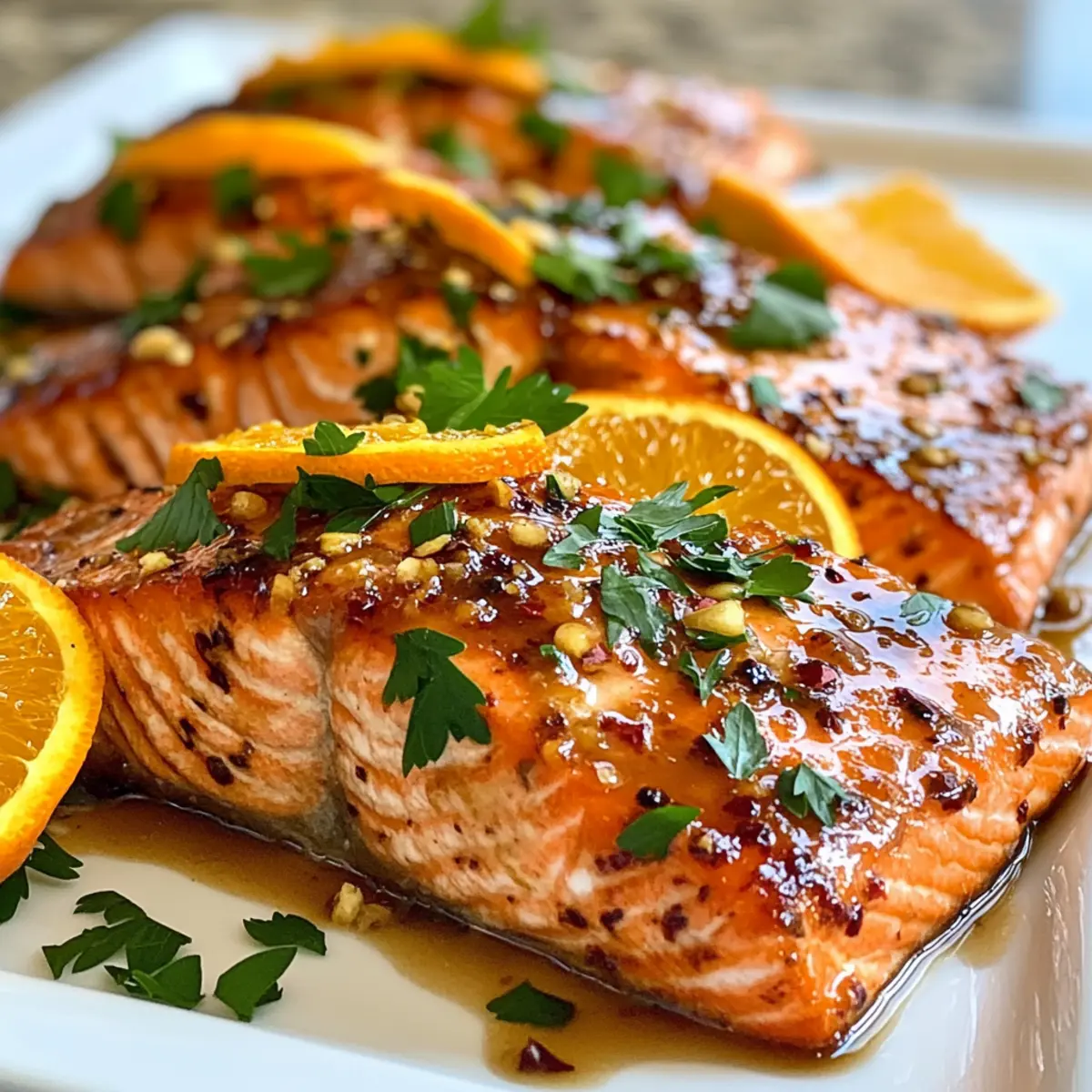 Nehmt die Pfanne vom Herd und garniert den orange glasierten Lachs mit frischer Petersilie für Farbe und Geschmack. Serviert den Lachs sofort warm, idealerweise mit gedämpften Gemüse oder Quinoa als Beilage. Dieses köstliche Gericht wird sowohl eure Familie als auch Freunde begeistern!
