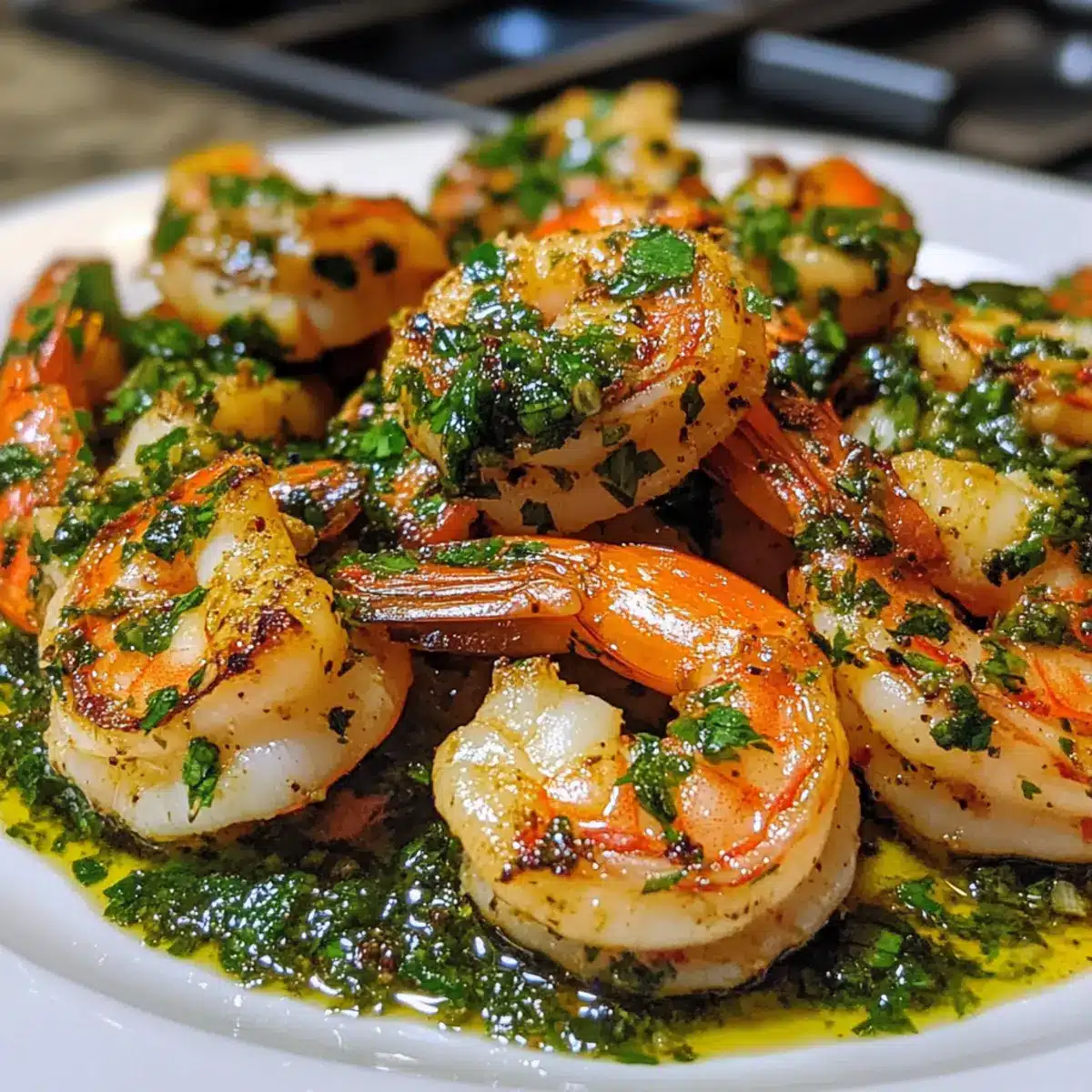 - Die gebratenen Garnelen auf eine Servierplatte übertragen und mit der Chimichurri-Sauce übergießen.
