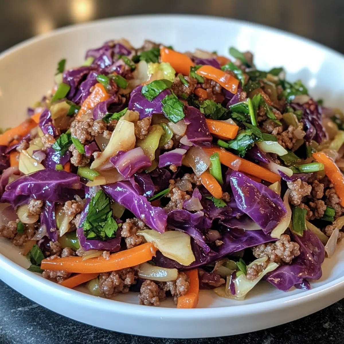 Schalte die Hitze aus und füge frische, gehackte Kräuter wie Petersilie oder Koriander hinzu. Mische alles gut durch, sodass die Kräuter gleichmäßig verteilt sind. Serviere das Rinderhackfleisch Kohl Pfannengericht sofort in tiefen Tellern und genieße die köstlichen Aromen und die knackige Textur des Gemüses.