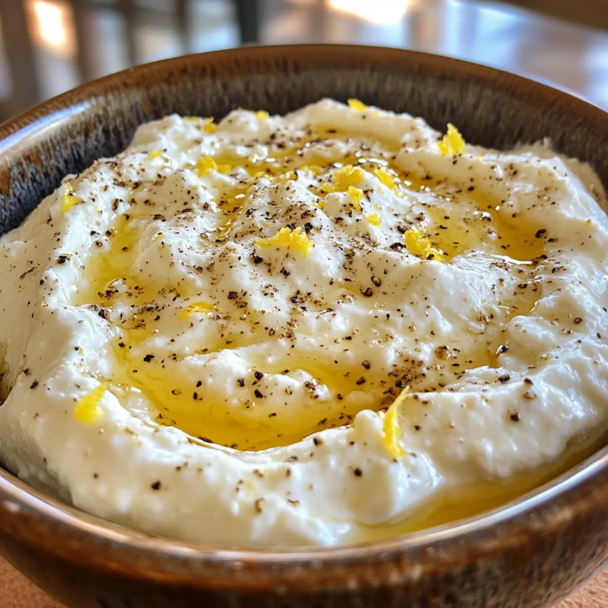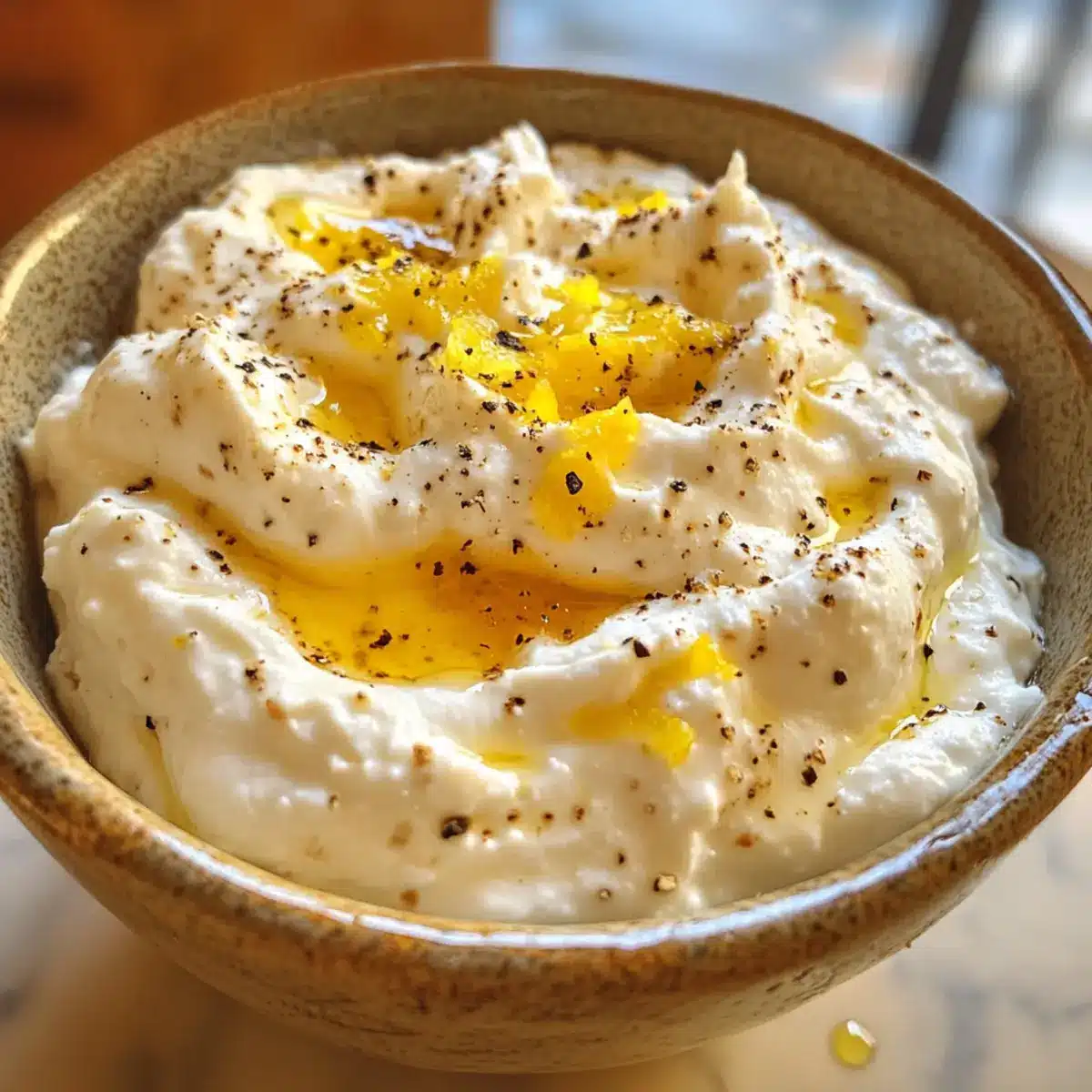 Verteile die cremige Ricotta-Mischung gleichmäßig in einer flachen Servierschüssel. Verwende die Rückseite eines Löffels, um dekorative Wirbel zu erzeugen, die dem Dip ein ansprechendes Aussehen verleihen. Diese schlichte Präsentation hebt den scharfen Ricotta-Dip mit scharfa Honig hervor und macht ihn einladend für deine Gäste.