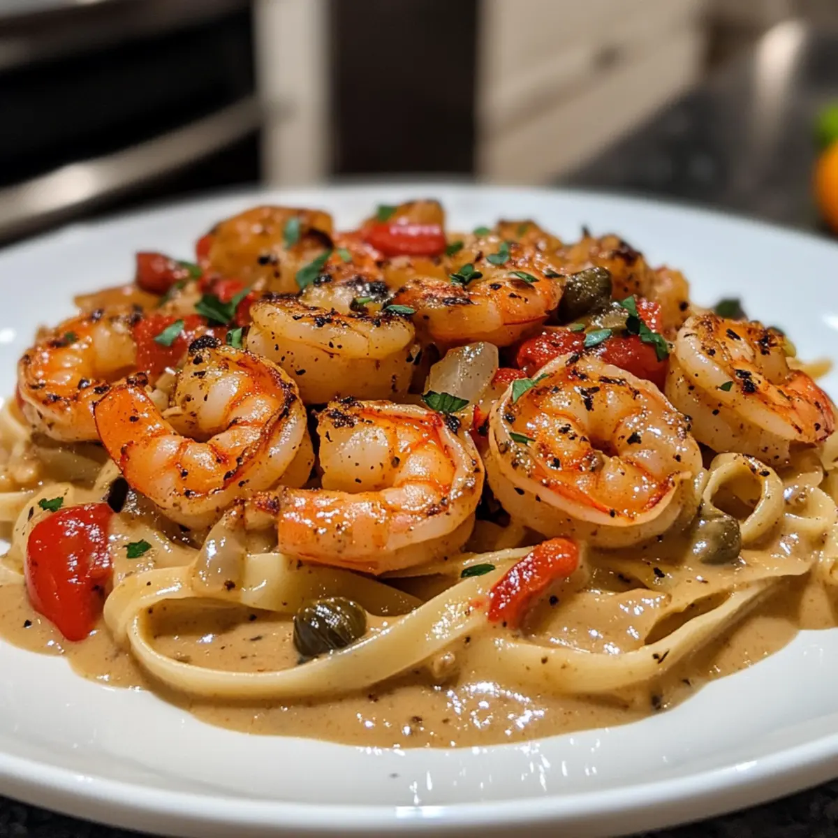 - Fügen Sie die gebratenen Garnelen, die sautierten Champignons, die gerösteten roten Paprika und die Kapern zur Sauce hinzu und erhitzen Sie alles für weitere 2-3 Minuten.