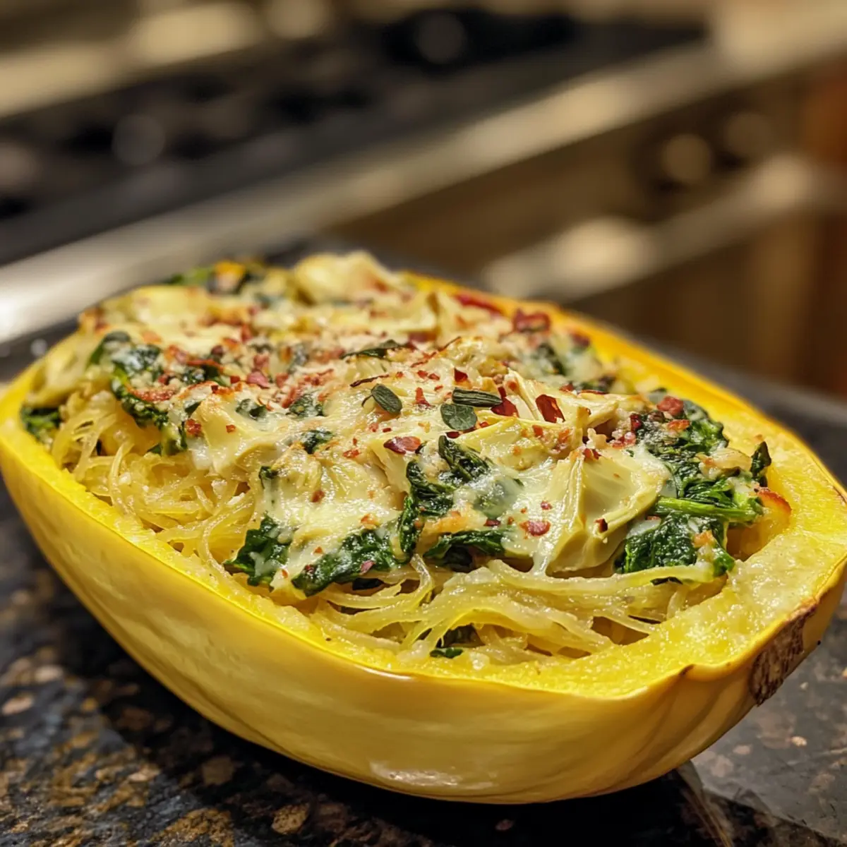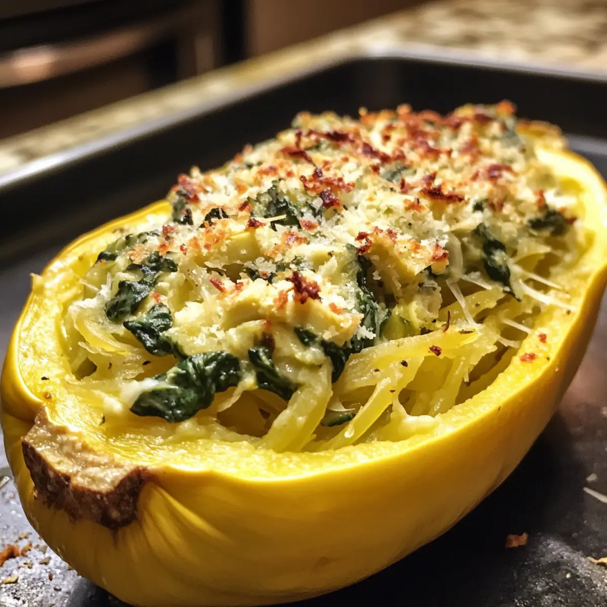 Entdecke die Freude am Kochen mit dem Spinat und Artischocken gefüllten Spaghetti-Kürbis, der nicht nur durch seinen Geschmack überzeugt, sondern auch visuell fasziniert!