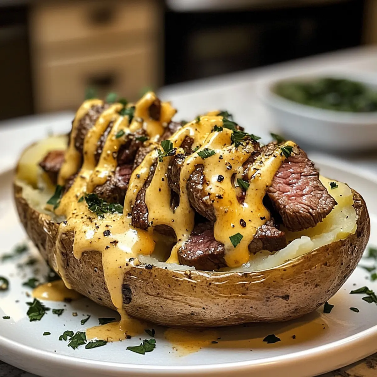 Sobald die Kartoffeln fertig gebacken sind, schneide sie der Länge nach auf und drücke die Seiten leicht nach innen, um eine Tasche zu bilden. Fülle jede Kartoffel großzügig mit den saftigen Steakwürfeln und drizzel die cremige Käsesauce darüber. Garniere abschließend mit frisch gehacktem Schnittlauch für einen zusätzlichen Farbklecks und Geschmack.