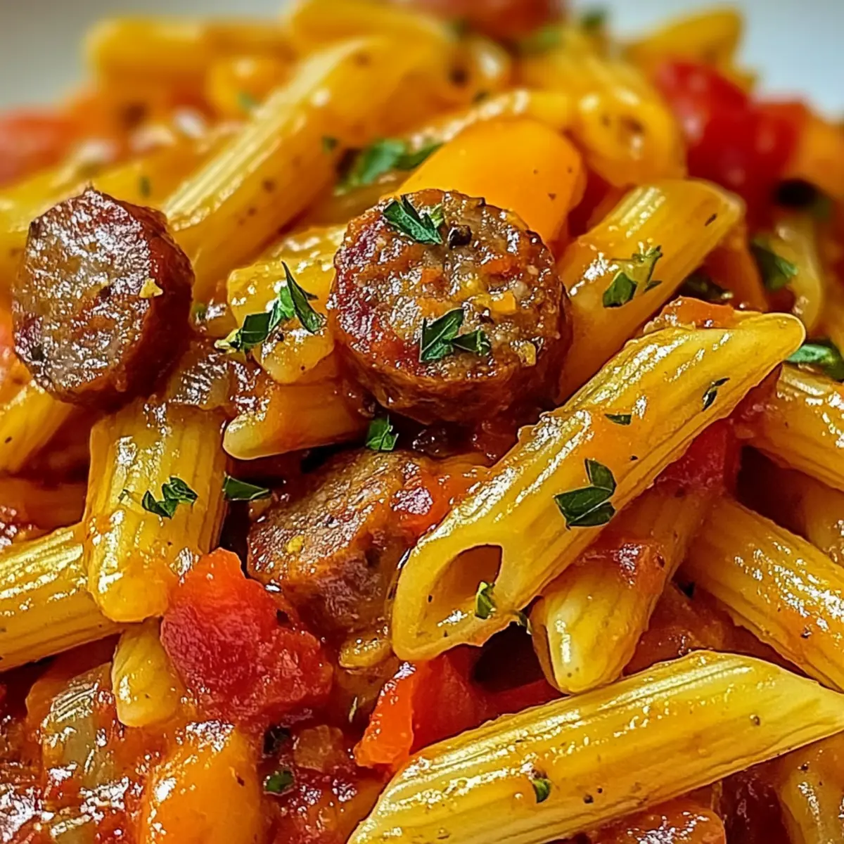 Mischen Sie die gekochte Pasta und die bereitgestellte Wurst in die Sauce in der Pfanne. Wenn die Sauce zu dick ist, fügen Sie etwas von dem reservierten Nudelwasser hinzu, um die gewünschte Konsistenz zu erreichen. Rühren Sie alles gut um, bis die Pasta gleichmäßig bedeckt ist. Servieren Sie die köstliche Süßpaprika-Wurst-Pasta und garnieren Sie sie nach Belieben mit frischer Petersilie.