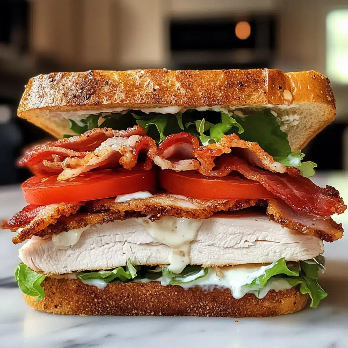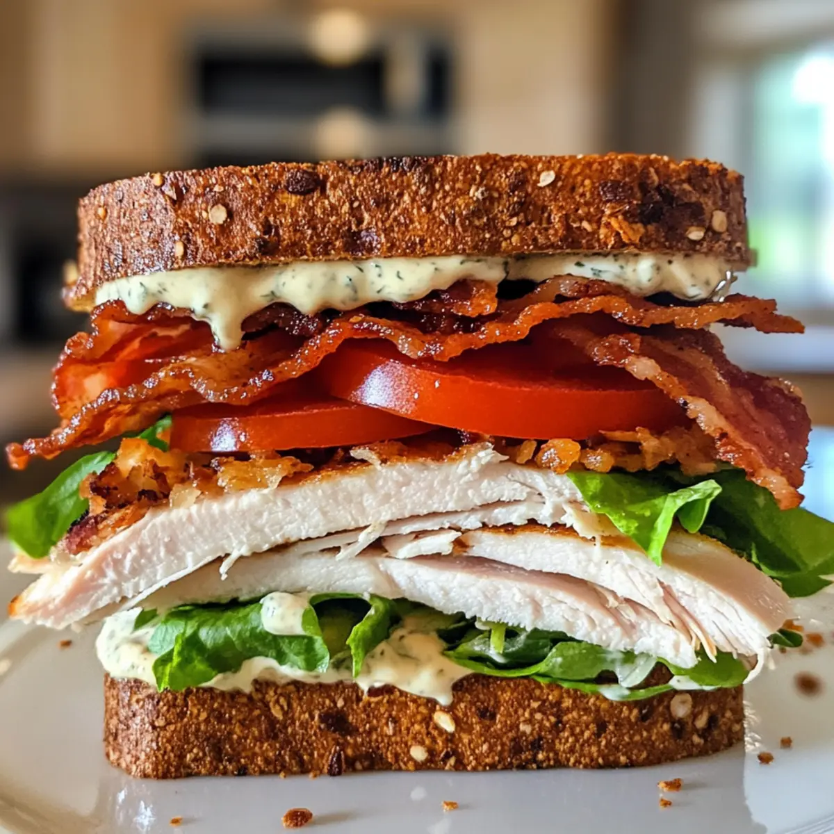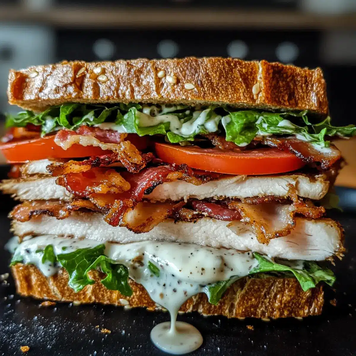 • Dressing-Überraschung: Experimentiere mit hausgemachtem Ranch-Dressing für einen gesünderen und geschmackvolleren Twist des Truthahn-Rindfleisch-Speck-Ranch-Sandwiches.