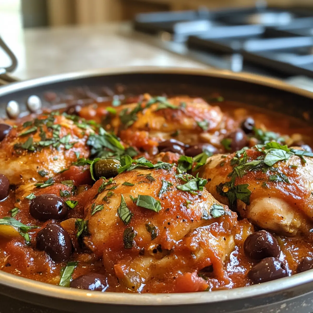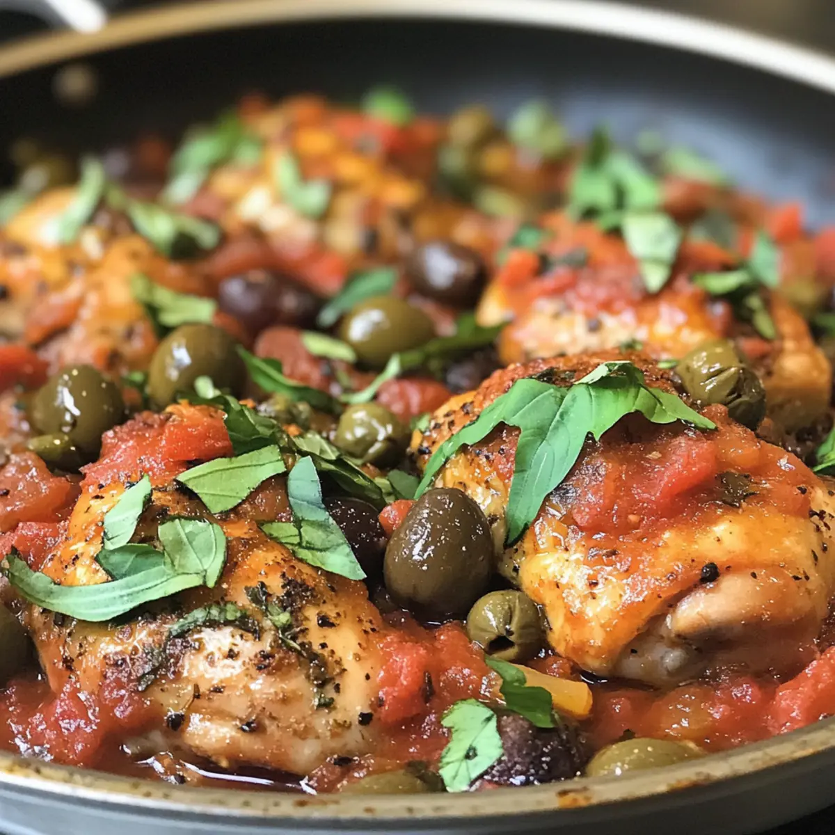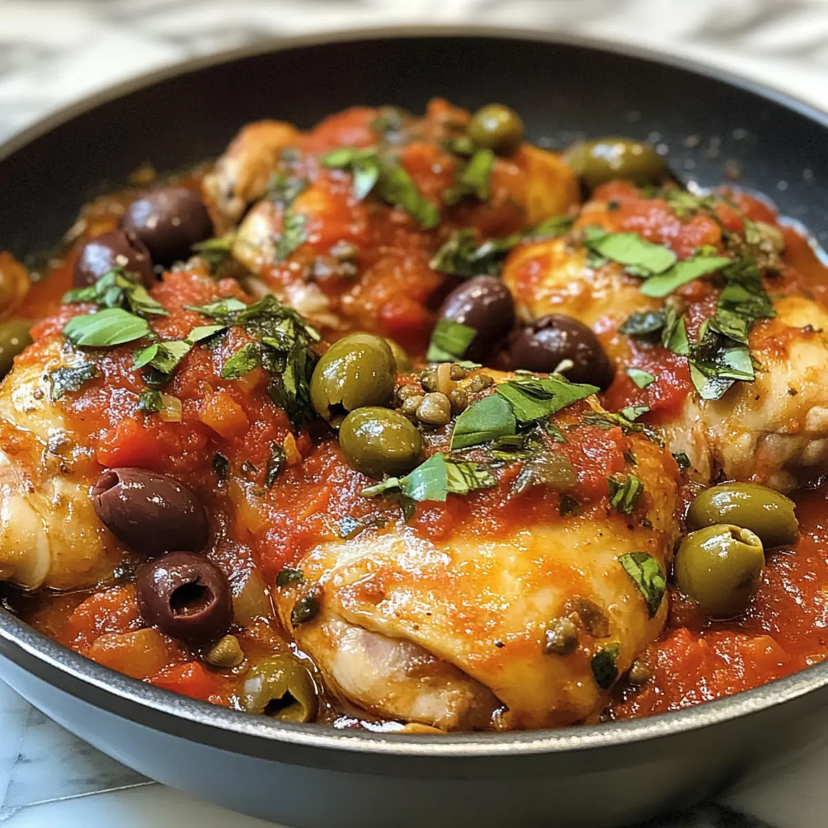 Reichhaltige Aromen: Die Kombination aus saftigen Hähnchenschenkeln und einer würzigen Tomatensauce mit Oliven und Kapern entfaltet ein unvergleichliches Geschmackserlebnis.