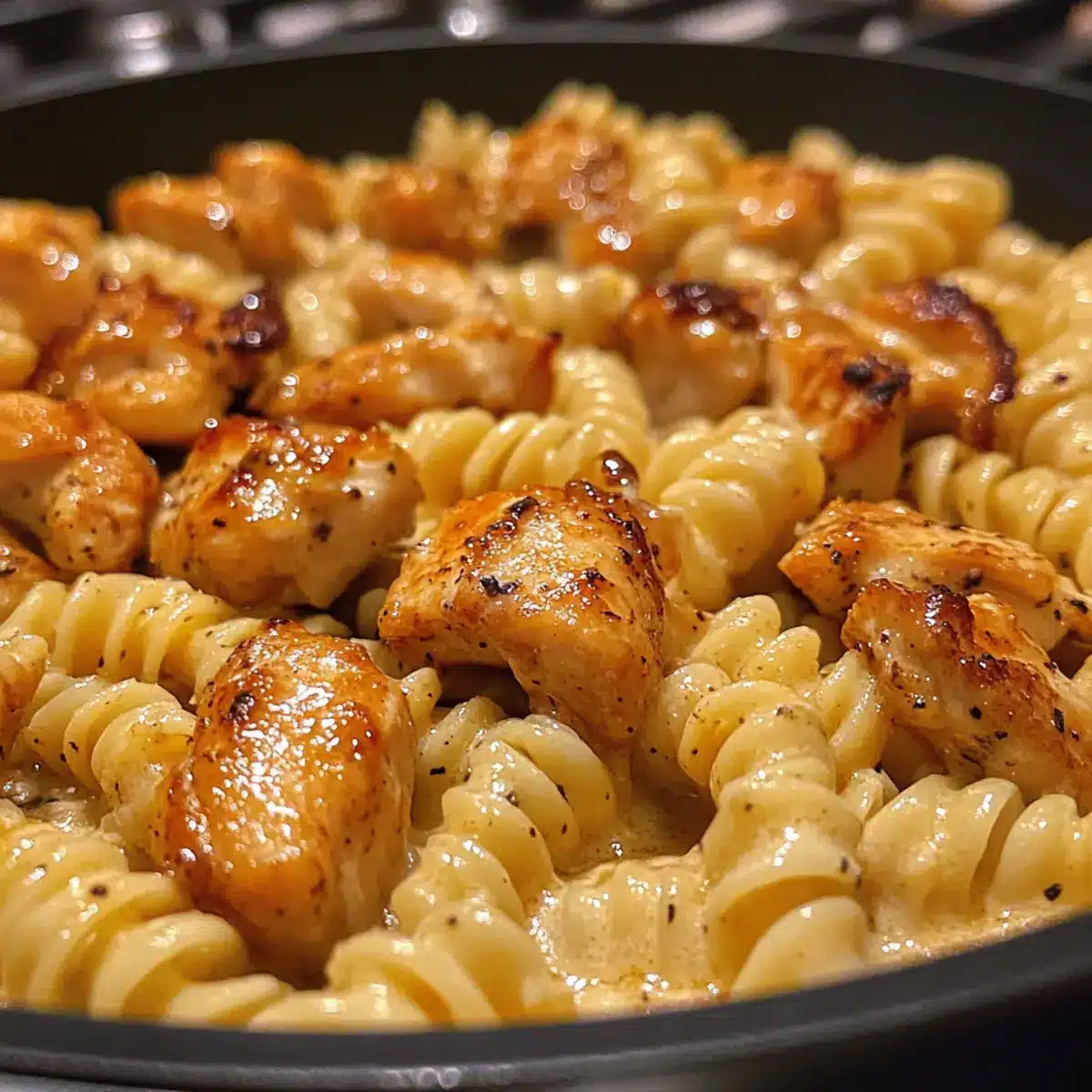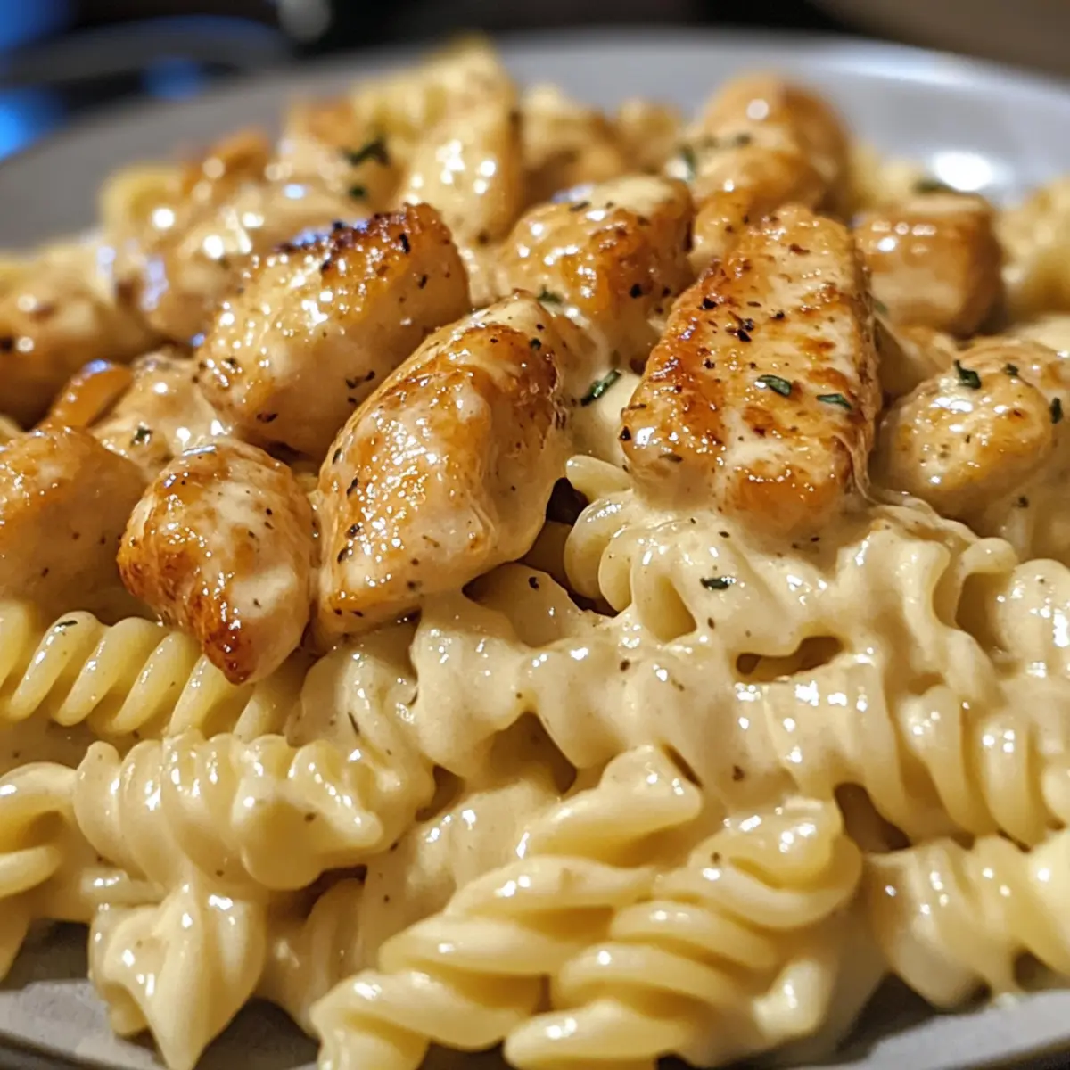 Perfekte Mischung: Die zarte Pasta umarmt die Sauce wunderbar und bietet eine gegenteilige Textur zu den knackigen Hühnchenstückchen.
