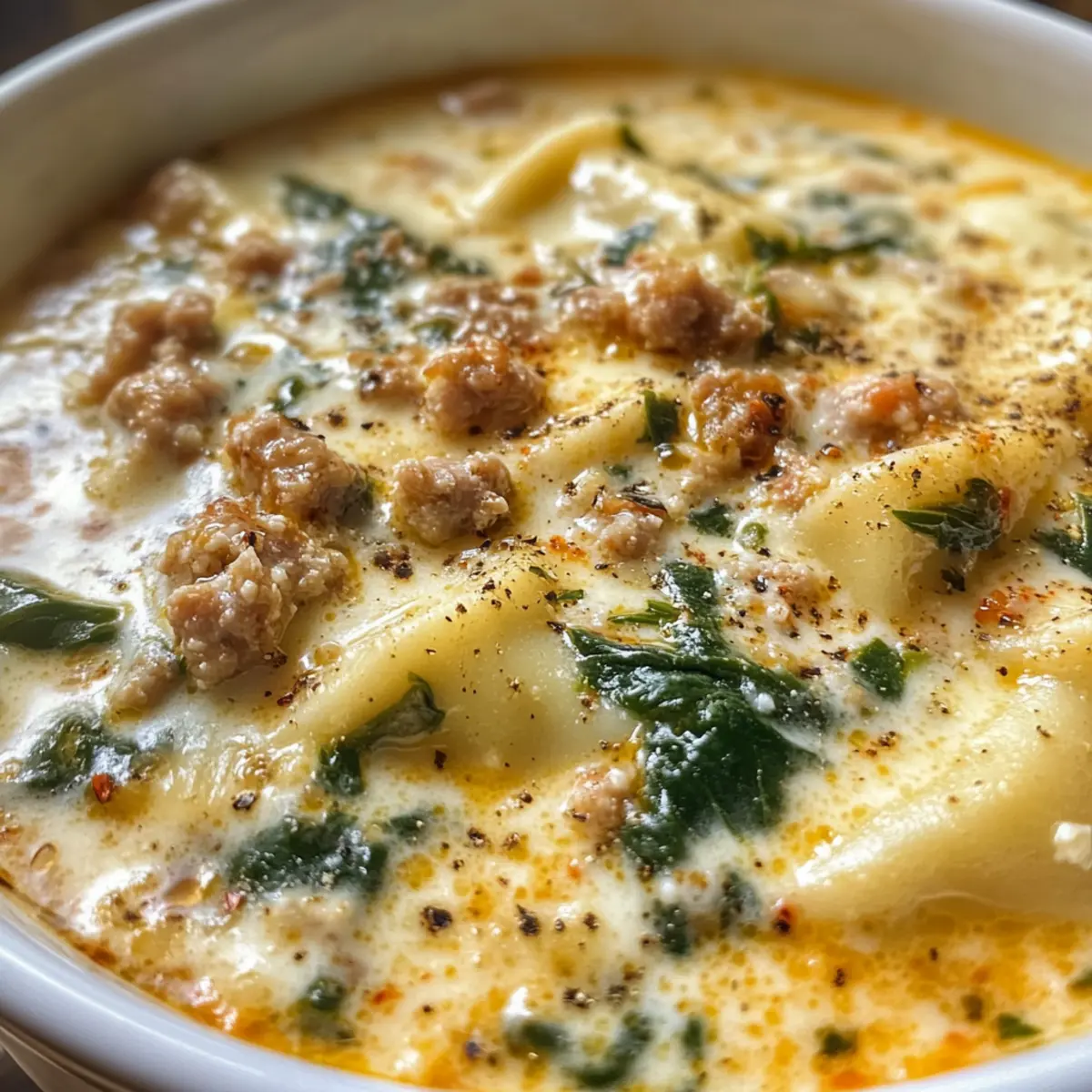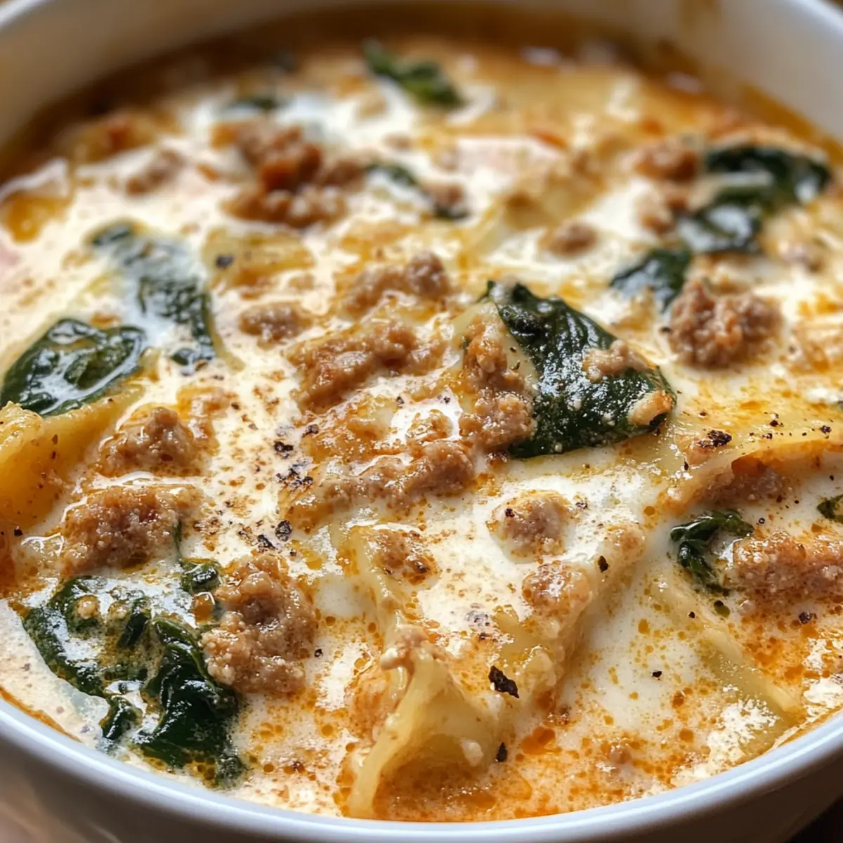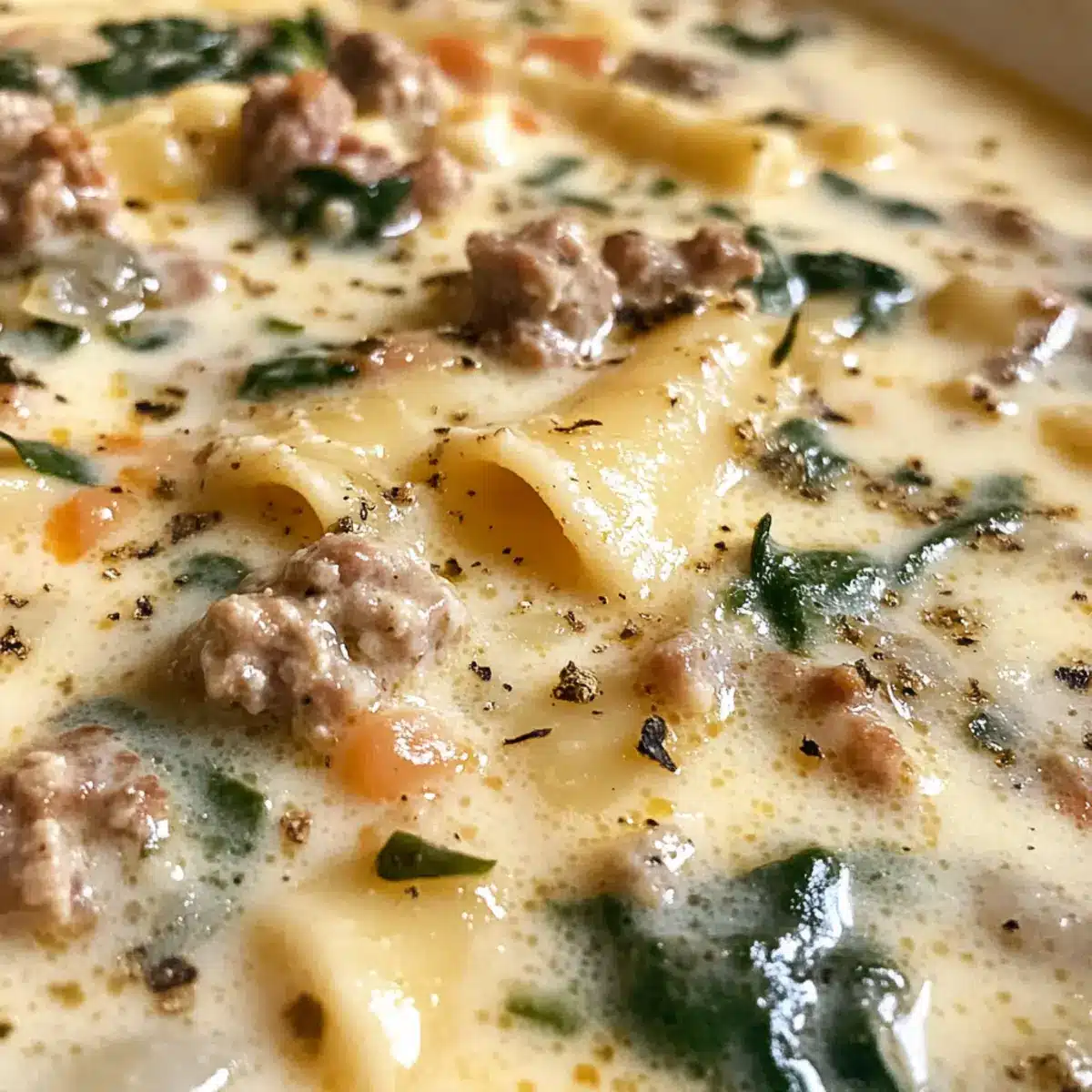 Cremiger Genuss: Diese weiße Lasagna Suppe bietet eine köstliche Kombination aus cremiger Brühe und zartem italienischen Wurstfleisch, die einfach zum Dahinschmelzen ist.