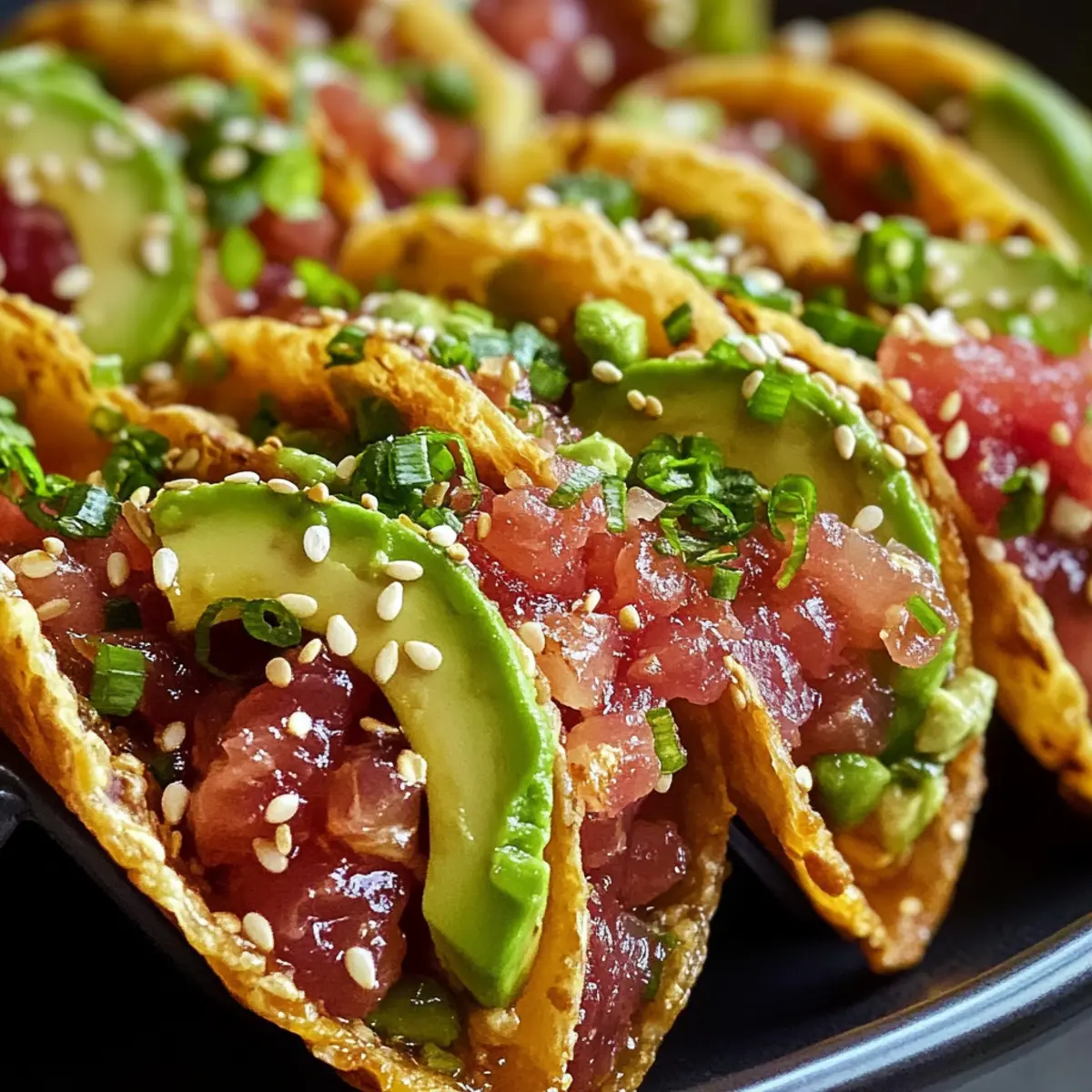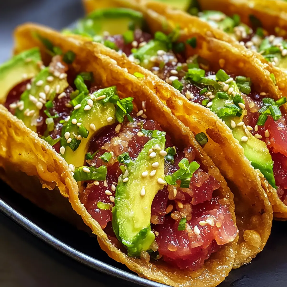 Einfachheit: Die Zubereitung ist kinderleicht und erfordert nur grundlegende Kochkünste. Vielseitigkeit: Sie können die Tacos nach Ihrem Geschmack anpassen – der Austausch von Zutaten wie Mayonnaise gegen griechischen Joghurt oder das Hinzufügen von Avocado macht es super flexibel. Eindrucksvoll: Diese Tacos sind ein absolutes Highlight auf jedem Buffet oder Dinner-Event – sie kombinieren das Beste aus Sushi und Tacos! Frische Aromen: Die Mischung aus würzigem Thunfisch und knackigen Wonton-Hüllen sorgt für ein unvergessliches Geschmackserlebnis. Schnell zubereitet: Ideal für spontane Gäste; Sie können sie in kürzester Zeit zaubern. Probieren Sie dazu auch ein erfrischendes Knoblauch Fladenbrot Rezept aus, um Ihr Menü zu ergänzen!
