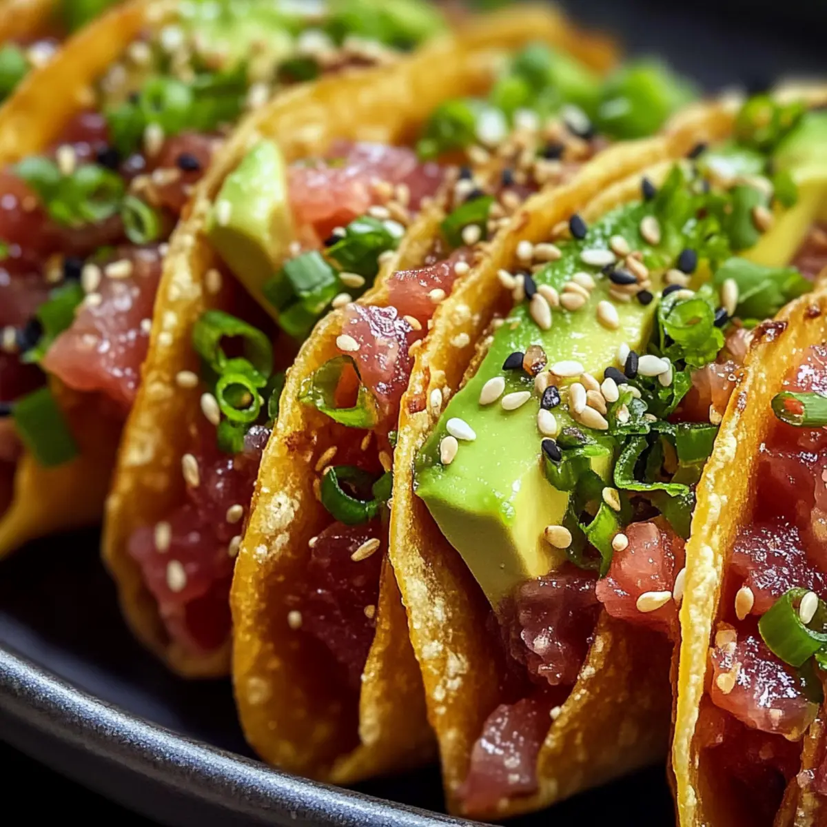 Vor dem Servieren zusammenstellen: Füllen Sie die Wonton-Hüllen erst kurz vor dem Servieren, um die Knusprigkeit zu erhalten – so schmecken die Würzigen Thunfisch-Tartar-Wonton-Tacos am besten.