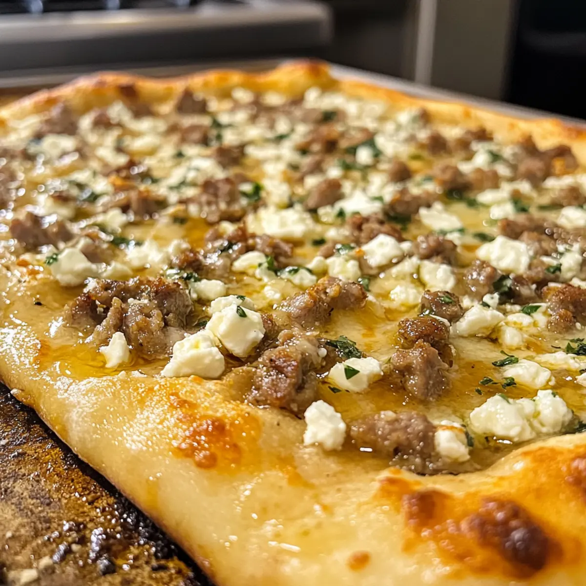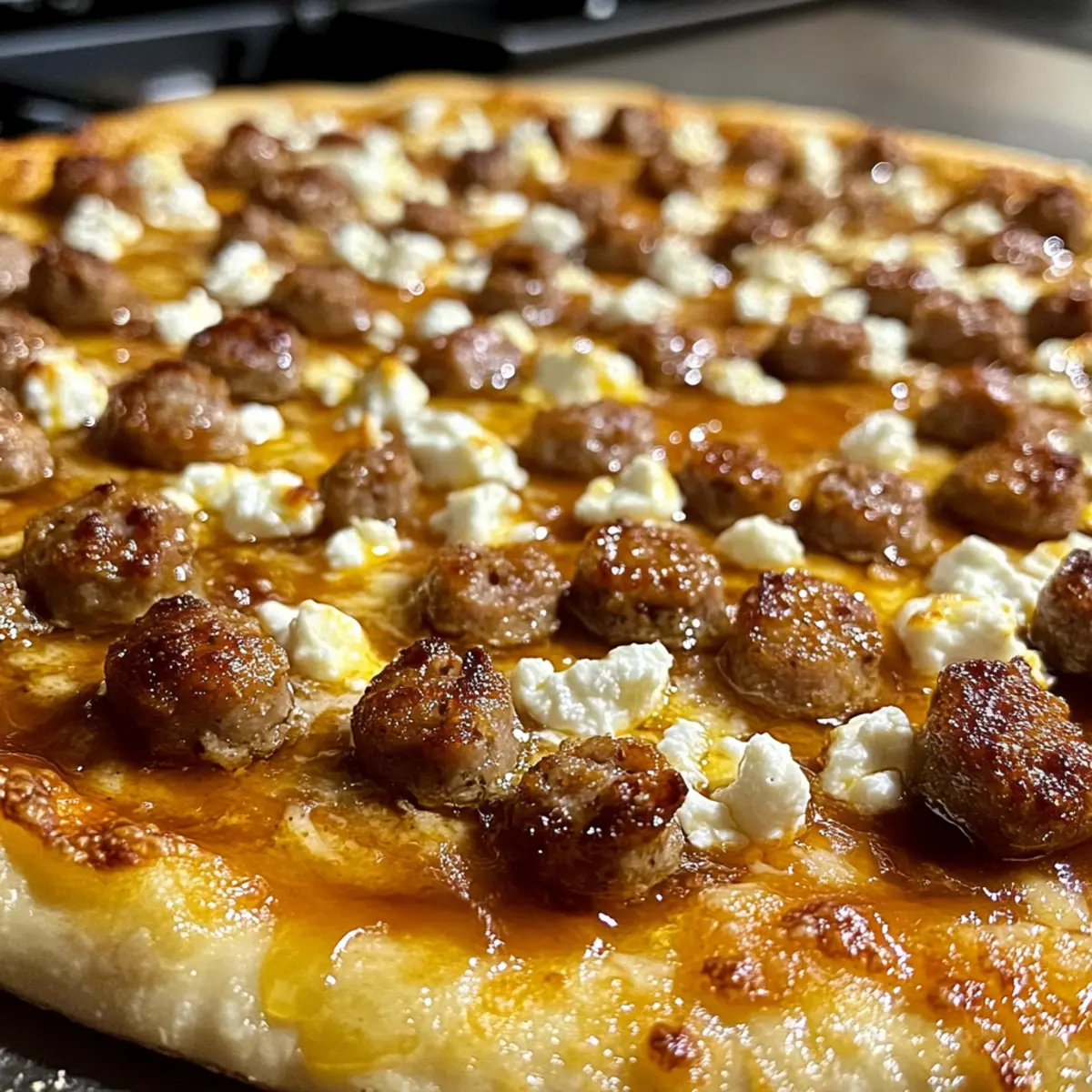 Die Wurst Feta Honig Pizza in den vorgeheizten Ofen schieben und 12-15 Minuten backen, bis die Kruste goldbraun und der Käse schön blubbert. Überprüfen Sie nach 10 Minuten, um sicherzustellen, dass die Pizza nicht überbacken wird—jede Sekunde zählt für die perfekte Schicht.