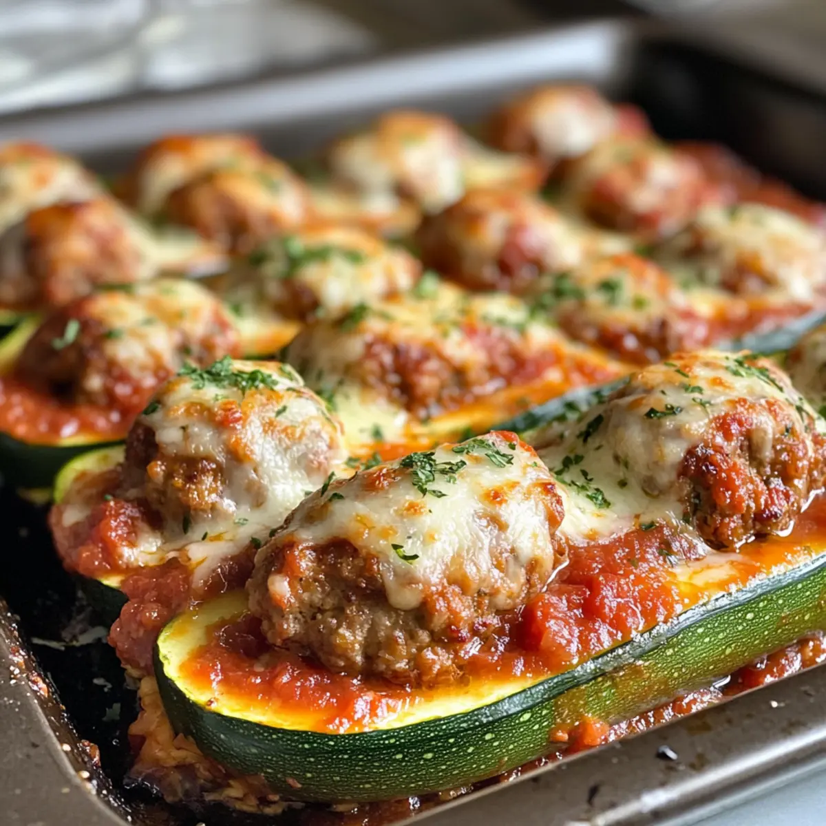 Platziere die Fleischbällchen auf einem Backblech und die Zucchinihälften auf dem anderen. Backe beides für ca. 16-18 Minuten, bis die Fleischbällchen eine Innentemperatur von 74°C (165°F) erreichen und die Zucchini gabelzart sind. Achte darauf, dass die Zucchini nicht zu lange backen, um eine matschige Konsistenz zu vermeiden.